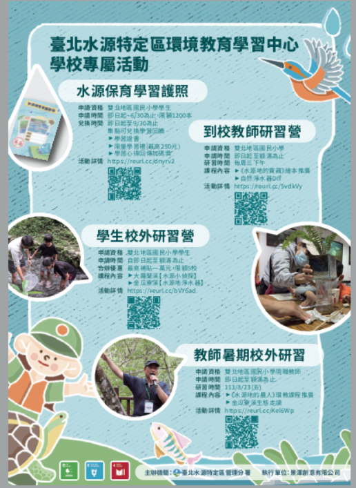 三、檢附臺北水源特定區環境教育學習中心學校活動DM1份,倘 有相關事宜,請逕洽執行團隊「景澤創意有限公司」郭先 生,電話:02-25956667;或該分署企劃科陳小姐,電話: 02-29173282轉351。
