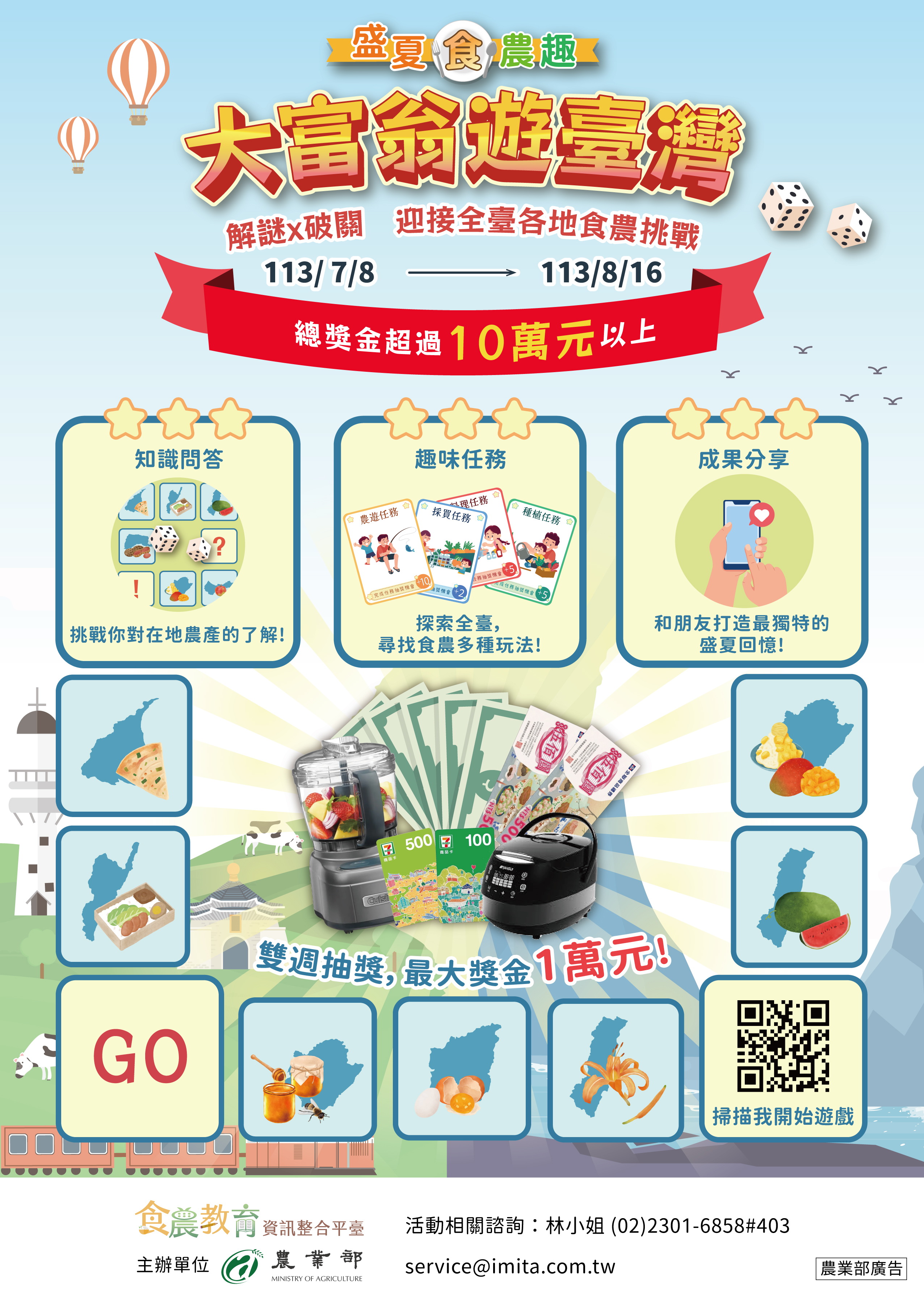 三、為促使大眾更加瞭解食農教育,農業部訂於113年7月8日至 8月16日舉辦「盛夏食農趣:大富翁遊臺灣」食農教育推廣 活動(網址:https://fae.moa.gov.tw/2024event/),提 供食農教育相關知識問答、任務體驗與成果分享等遊戲,參與活動即可抽獎,總獎金超過10萬元,有興趣者歡迎踴 躍參與。