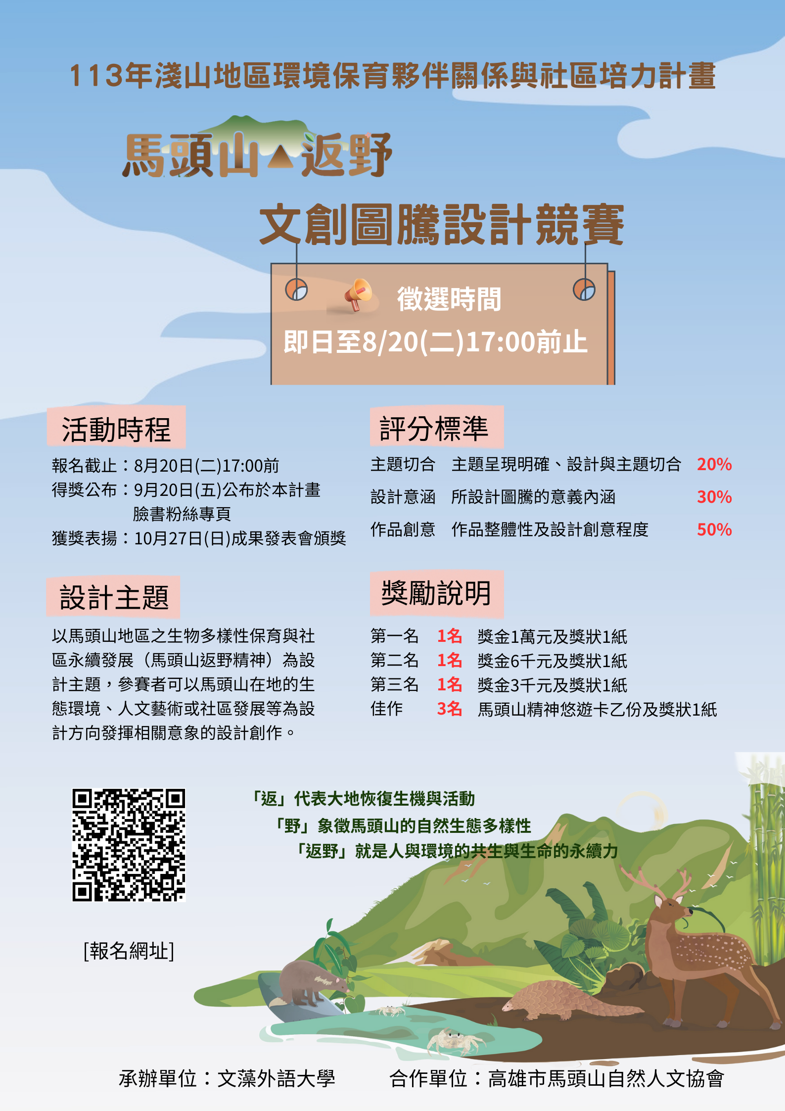 二、為使更多人認知馬頭山,並加深民眾對馬頭山地區自然生 態多樣性維護的公民意識與價值,本計畫辦理「馬頭山返 野文創圖騰設計競賽」(以下簡稱本活動)。