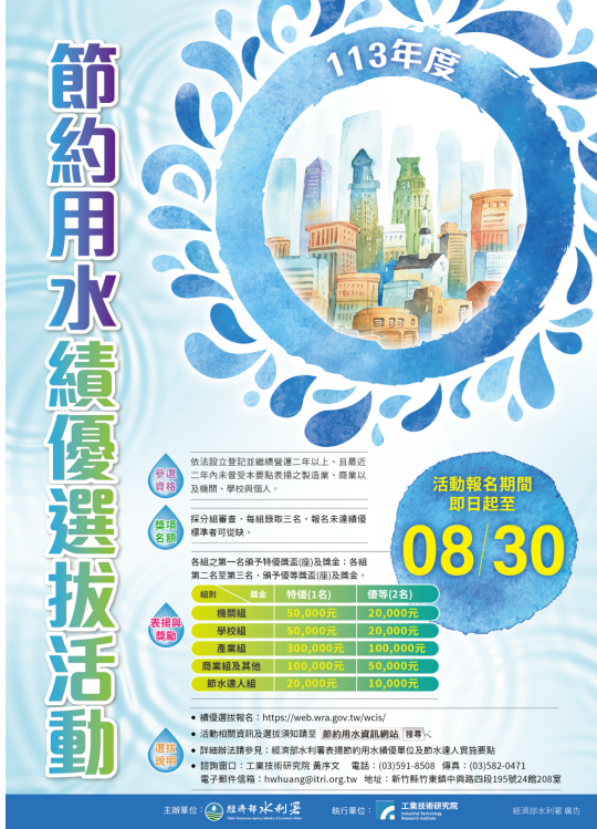 二、經濟部水利署為鼓勵全民節約用水,促進愛護水資源具體 行動,達到水資源永續利用之目的,辦理旨揭活動,選拔 並表揚推動節約用水績效卓越之公、民營企業、機關學校 與達人。