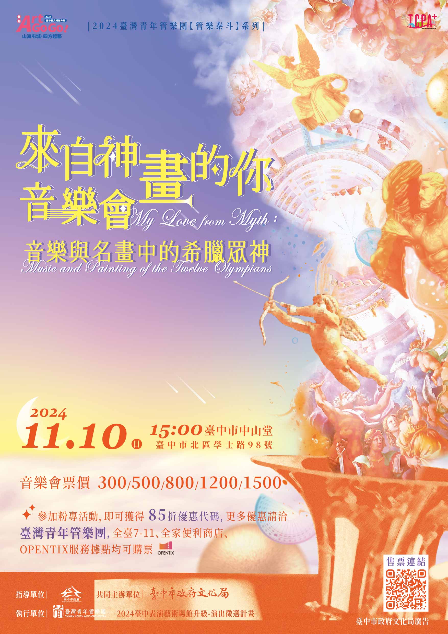 一、時間及地點:113年11月10日星期日15:00 假臺中市中山 堂 二、節目介紹:臺灣青年管樂團『管樂泰斗』系列音樂會, 2024隆重呈現【來自神畫的你】音樂會-音樂與名畫中的希 臘眾神,是一場融合希臘神話與西班牙作曲家奧斯卡·納瓦 羅的《奧林帕斯諸神》交響組曲的音樂會。十個樂章生動 描繪十二位神祗,以具挑戰性的曲目展現管樂團的卓越演 奏技巧;特邀Podcaster葵花子在樂章中介紹名畫,讓觀眾 更深入理解神話故事。 音樂會還包含2024委託創作《甘露水音畫-永恆的剎那》交響管樂曲,致敬雕塑作品「甘露水」,誠摯邀請貴校全體師生加入 這場神話與藝術的音樂旅程,一同見證奇妙的永恆剎那。 三、OPENTIX售票系統線上購票,訂票流程說明請詳見附檔。 購票連結:https://www.opentix.life/event /1810665502842470400 如需海報或相關購票問題,請聯繫臺灣青年管樂團 陳小姐 0911-681372,電子信箱taiwanyouthwindorchestra@gmail. com。 四、【票價資訊】音樂會票價300/500/800/1200/1500元 (一)參加粉專活動,即可獲得85折優惠代碼,更多優惠請洽 臺灣青年管樂團全臺7-11、全家便利商、OPENTIX服務據 點均可購票。 (二)本節目配合文化幣專案,席位有限歡迎使用文化幣購 票;六人以上享8折優惠。 五、檢附旨揭音樂會海報電子檔。