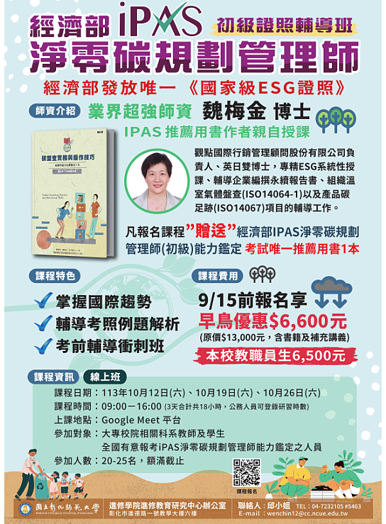 一、「113年iPAS淨零碳規劃管理師(初級)能力鑑定輔導班(線 上班) 」