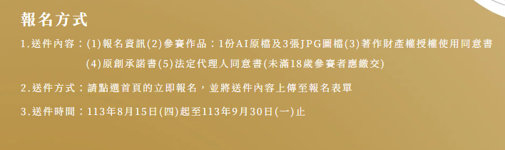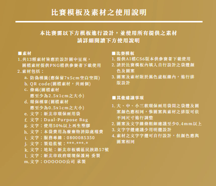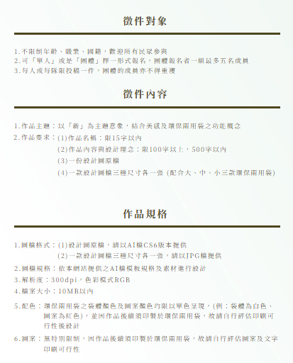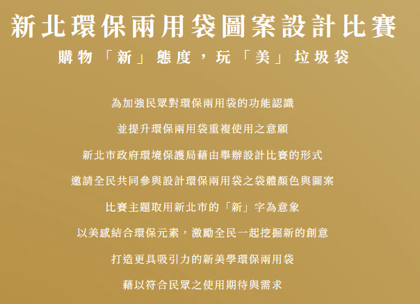 二、該局為加強民眾對環保兩用袋的認識、提升袋體設計美 感,以增加重複使用意願,特舉辦旨揭全國性徵圖比賽, 報名期間自即日起至113年9月30日止,本次徵件比賽「首 獎」作品將製成新北市新版的環保兩用袋,比賽詳細規則 及報名方式,請至活動網站(網址:https://www.dualpurposebag.com/)查詢。
