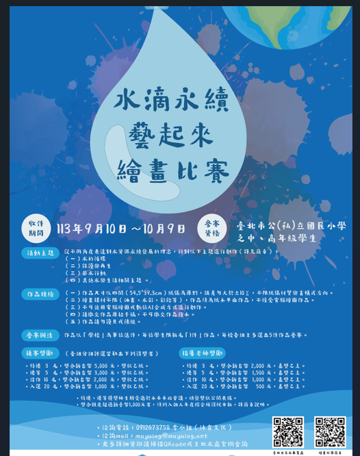 三、檢送113年「水滴永續藝起來」繪畫比賽簡章及海報各1份 (如附件)。