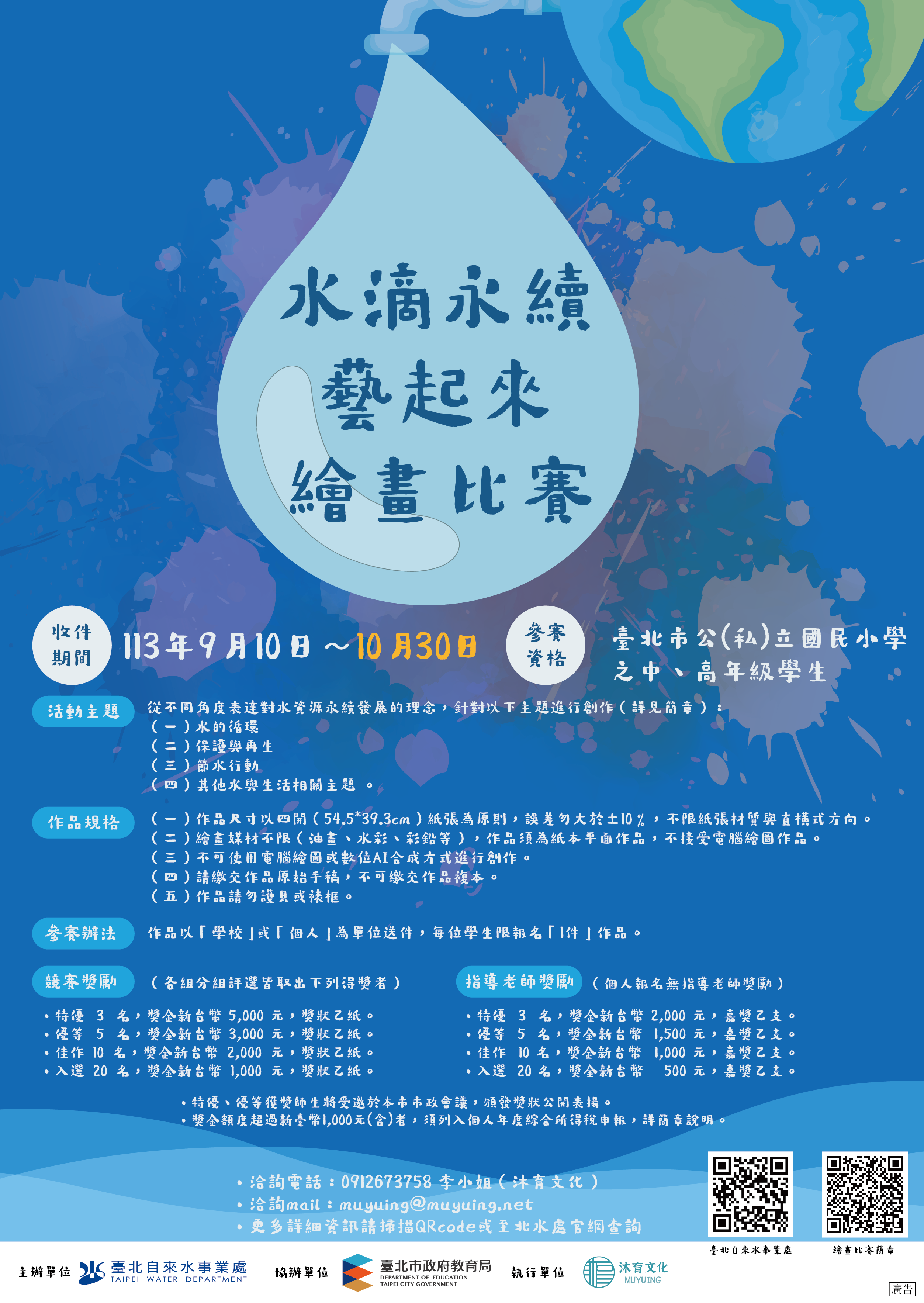 三、檢送113年「水滴永續藝起來」繪畫比賽簡章(修正版)及 海報各1份(如附件)。