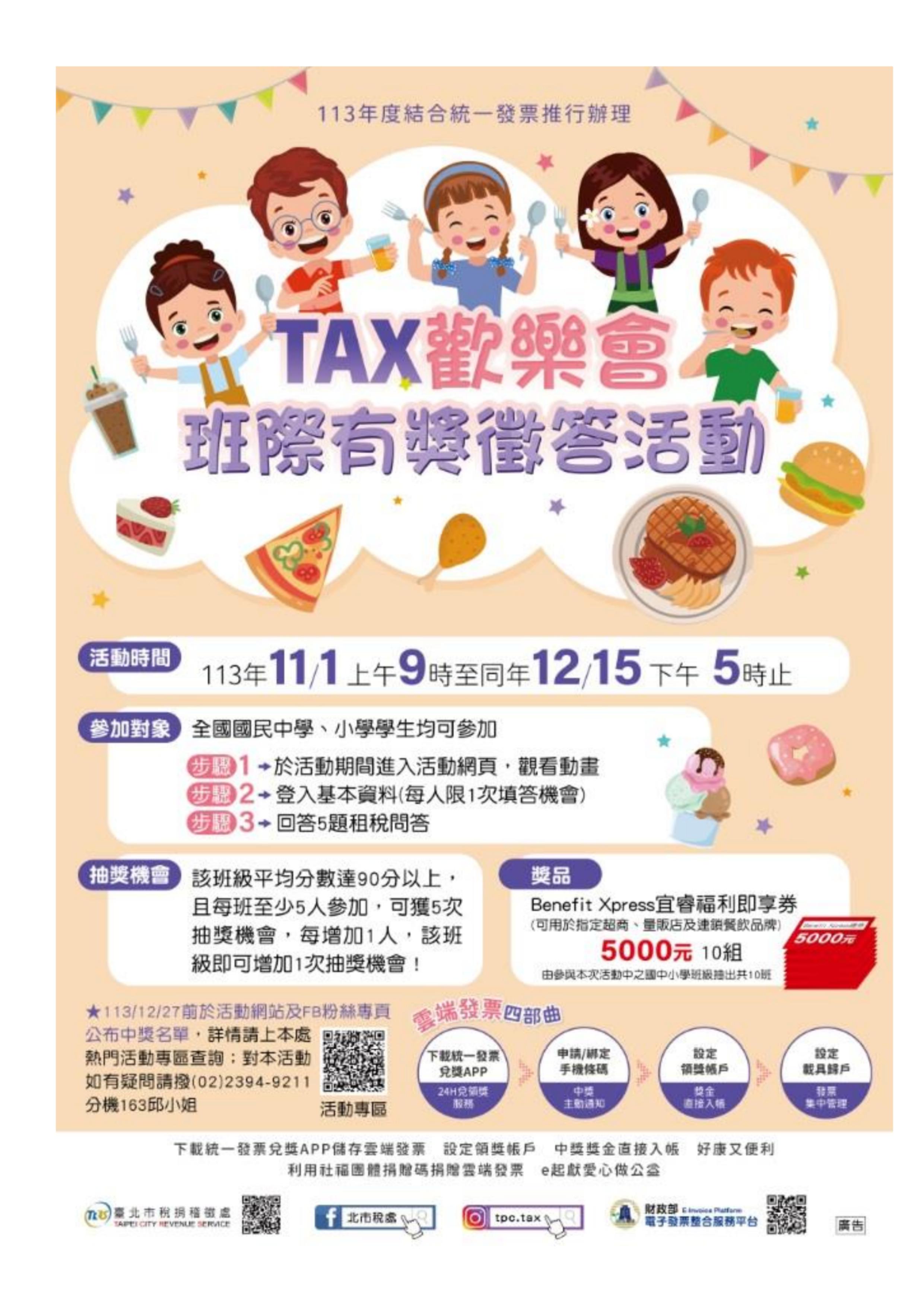 一、旨揭活動係本處113年度結合統一發票推辦學校教育推廣活 動,目的在使國中、國小學生瞭解國稅與地方稅、稅收的 用途、依法納稅義務、納稅者權利保護官等相關知識,以 及宣導多元繳稅管道及行動支付結合雲端發票之優點等, 運用全國性租稅教材舉辦之線上閱讀學習活動。 二、前開活動自113年11月1日上午9時至113年12月15日下午5 時。活動期間至活動網頁(網址://services.arpa. tpctax.dof.gov.taipei/act/113taxfun/)觀看動畫(須 登錄基本資料供聯繫),並回答5題稅務問題(以學校班級 為單位,每班至少5人參加,且該平均分數達90分以上)即 可獲5次抽獎機會,每增加1人,該班級即可增加1次抽獎機 會,活動將抽出10班提供Benefit Xpress福利即享券5,000元(面額500元10張),並於113年12月27日前公布於本處 活動網站及FB粉絲專頁。 三、更多活動詳情請上本處熱門活動專區查詢,或電話洽詢本 分處承辦人吳先生。