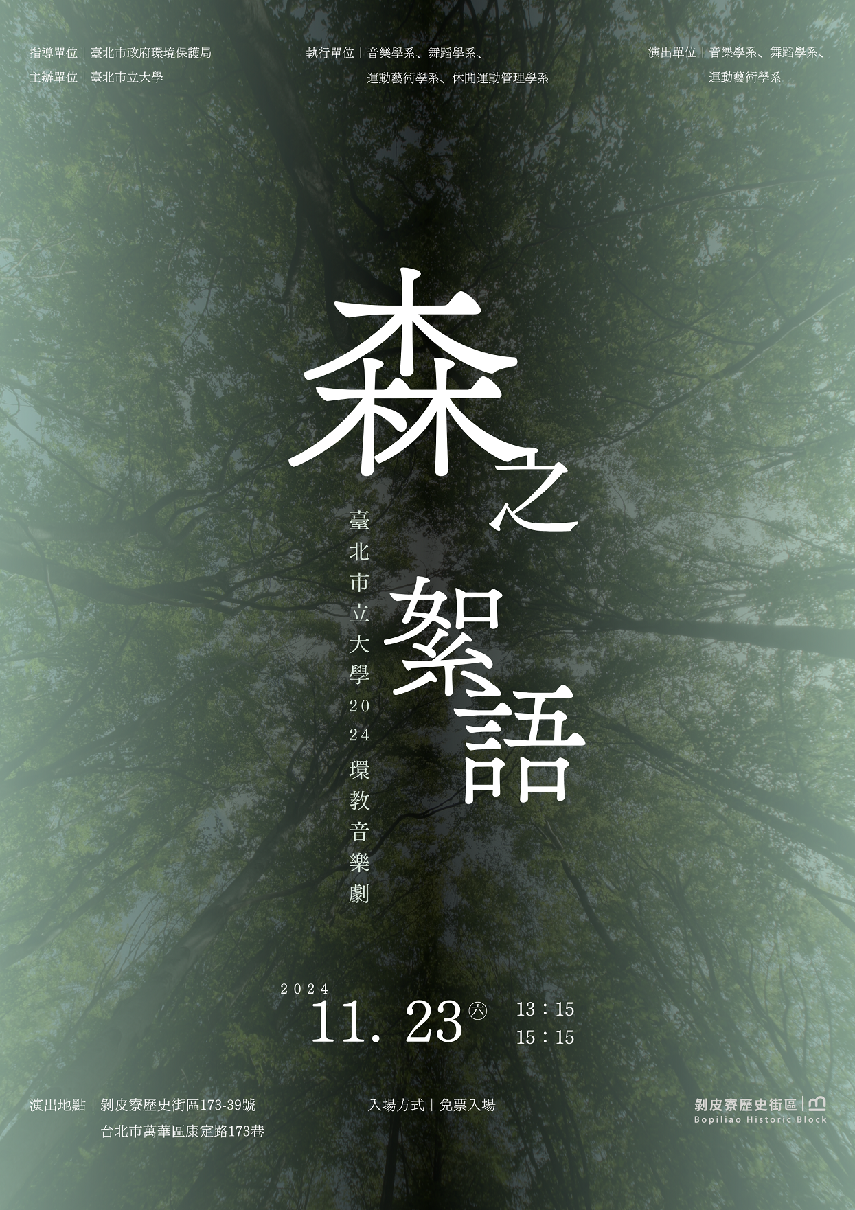 一、都市發展與綠色空間保存間的平衡是當代重要課題,由本 校音樂學系、舞蹈學系、運動藝術學系及休閒運動管理學 系共同舉辦「環境教育-《森之絮語》音樂劇」展演,透 過音樂劇引導觀眾反思永續發展的重要性,持續為環境保 護盡一份心力。為達教育及推廣目的,敬邀貴校師生一同 參與欣賞。 二、本案演出相關訊息如下: (一)日期:113年11月23日(六) (二)地點:剝皮寮歷史街區173-39號(臺北市萬華區康定路 173巷,臺北市鄉土教育中心旁)。 (三)演出場次:13時15分、15時15分共兩場次,每場約30分 鐘。 (四)更多演出資訊請至本校音樂學系粉絲專頁查詢(https://www.facebook.com/utaipeimusic)。 三、檢附旨揭音樂會海報供參。