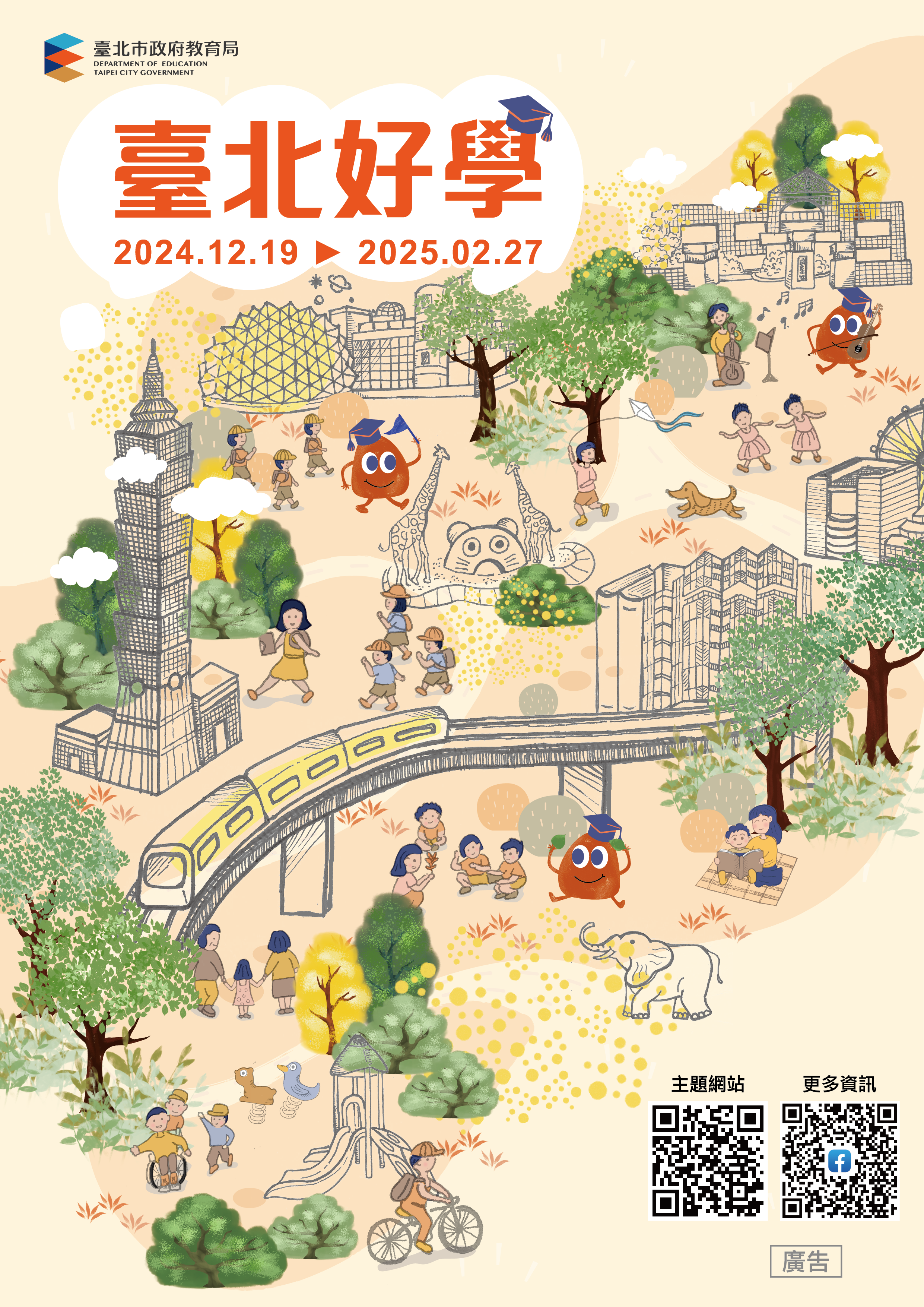 「臺北好學」活動,為推廣本市教育成果,活動 內容以邀請民眾走進平日鮮少開放的教育場域「臺北好好 學」體驗活動及以臺北10大好學為核心的「臺北城市走讀 GO!」兩大主軸推動,其中「臺北城市走讀GO!」規劃於114 年1月2日至2月27日在臺北捷運(忠孝復興站)北側藝文 廊,以特展圖文並茂方式呈現臺北教育亮點,同時為推廣 閱讀教育、自主學習及響應淨零碳排目標,結合本市圖書 館與捷運站相關據點,邀請民眾搭乘捷運參與。
