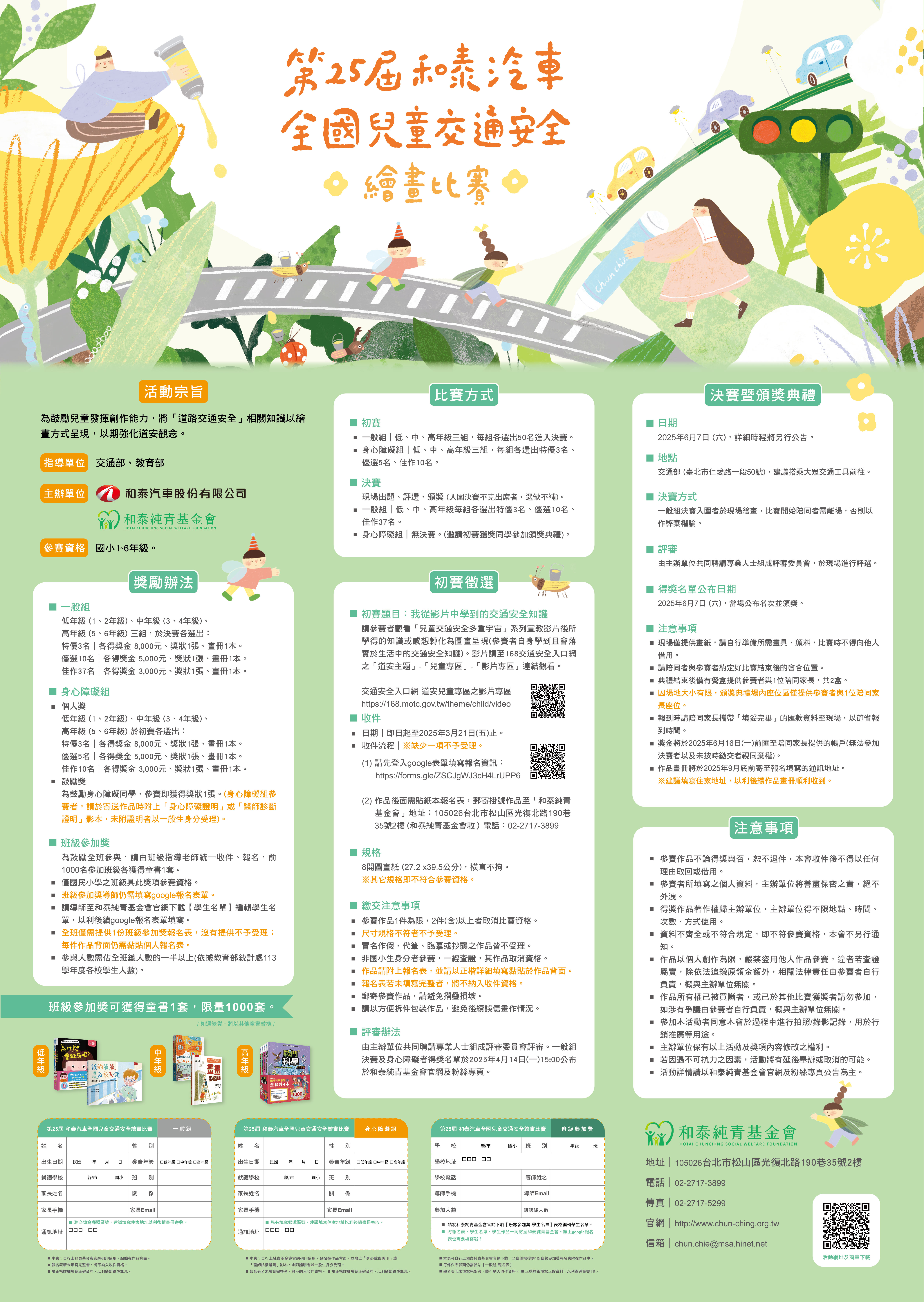 一、依教育部113年12月31日臺教社(一)字第1130136021號函 辦理。 二、旨揭繪畫比賽之參加對象為全國國民小學學生,即日起至 114年3月21日截止報名(以郵戳為憑),歡迎學生踴躍報 名參加。 三、相關活動訊息請詳閱活動DM或至該基金會官網查詢(網 址:http://www.chun-ching.org.tw/)