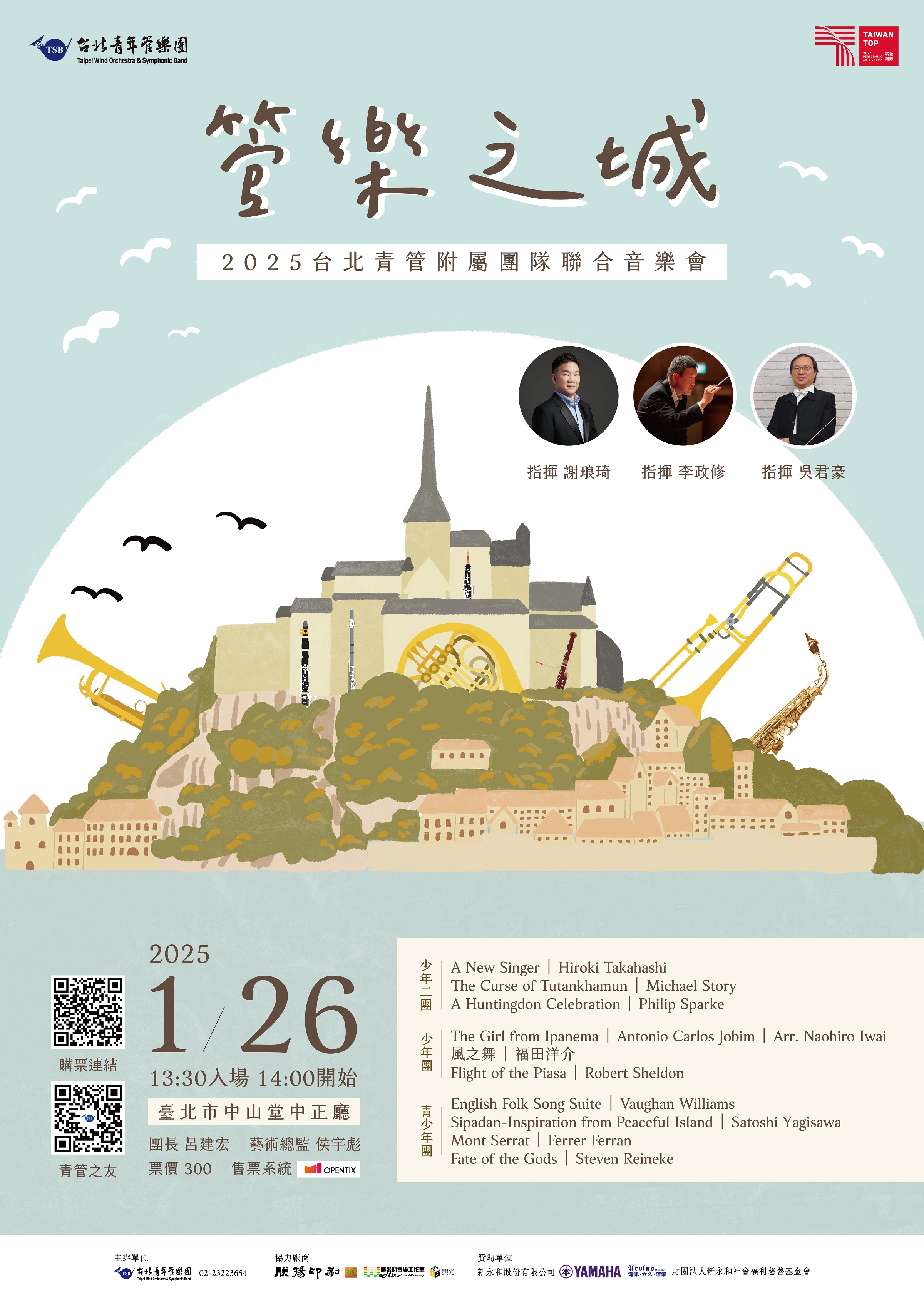 一、2025台北青管附屬團隊聯合音樂會,由謝琅琦、李政修與 吳君豪3位老師,指揮台北青管附屬團隊演出,帶來一連串 耳熟能詳的管樂經典曲目。 二、旨揭音樂會相關訊息如下: (一)演出時間:114年1月26日 (星期日)下午2點。 (二)演出地點:臺北市中山堂中正廳(臺北市中正區延平南 路98號)。 (三)購票與折扣優惠查詢請至OPENTIX售票系統 (https://reurl.cc/xpvVxL);相關問題請逕洽台北青管 樂團經理王先生(02-2322-3654)。 (四)相關音樂會資訊請至台北青年管樂團臉書粉絲專頁查詢 (https://www.facebook.com/tsbgroup/)。
