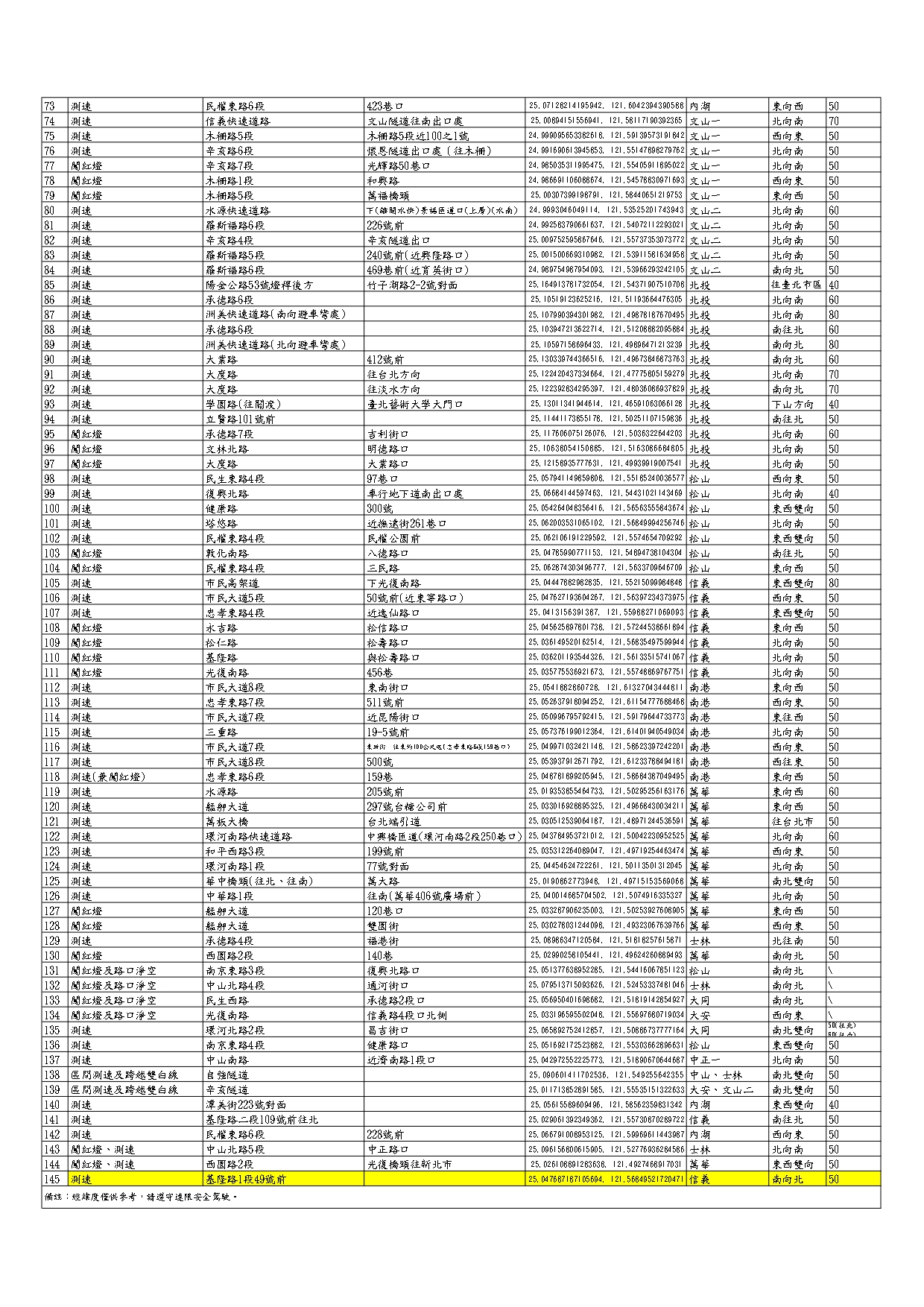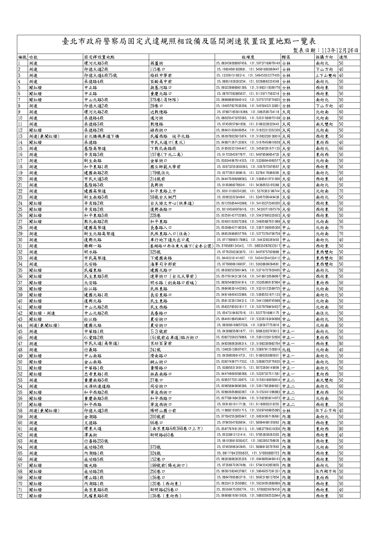 轉知本府警察局現有「固定式違規照相設備及區間測速裝 置設置地點一覽表」及公告各1份。