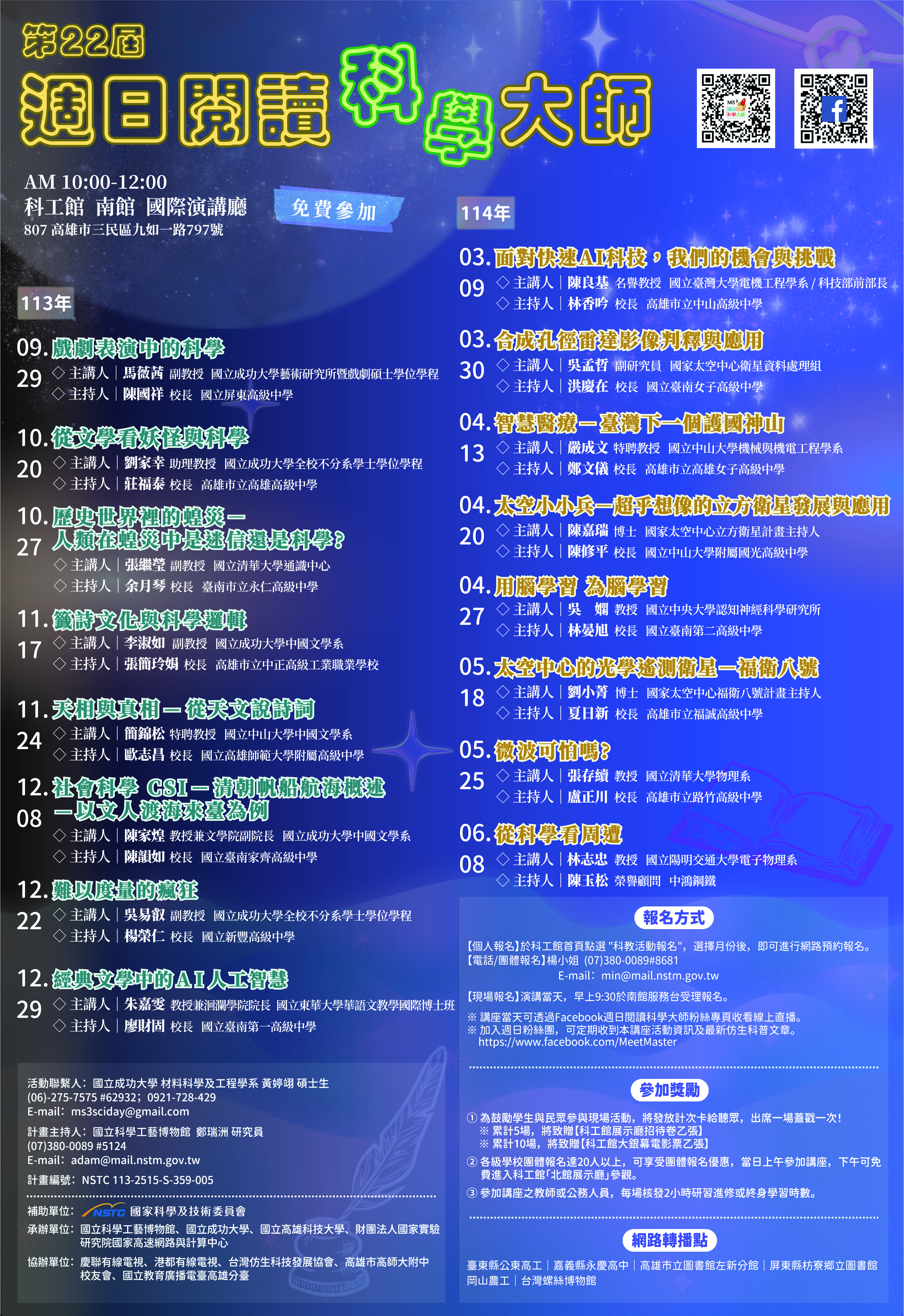 二、「週日閱讀科學大師」講座目的為引發學生及社會大眾對 於科學的理解、興趣及參與,以增進其科學素養,是專為 年輕朋友與社會大眾在週日上午舉辦的科普講座。