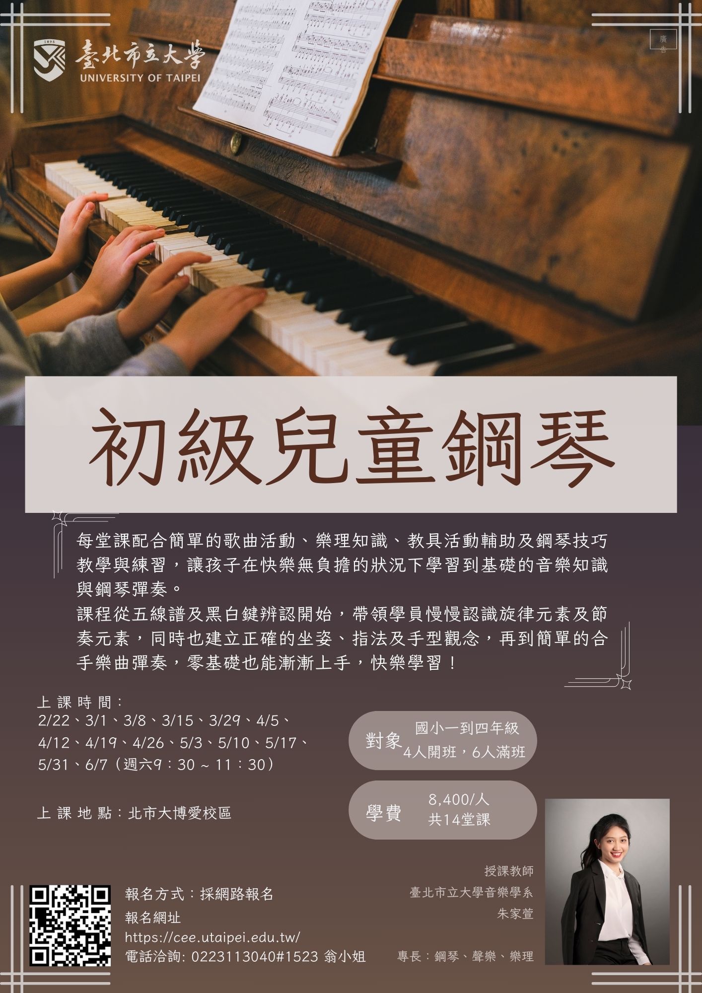 一、旨揭活動業公告於本校博愛校區進修推廣處網站 (https://cee.utaipei.edu.tw/),課程詳細資訊請至網 站查詢。 二、辦理時間: 114年2月22日至114年6月7日。 三、招生對象:國小一年級至四年級學生。 四、報名日期:即日起至114年2月10日止。 五、請貴單位協助向在校生或職員宣導旨揭活動,至紉公誼。 六、檢附課程招生海報1份,如有課程相關疑問,請逕洽本案承 辦人翁小姐(02-23113040轉分機1523)。