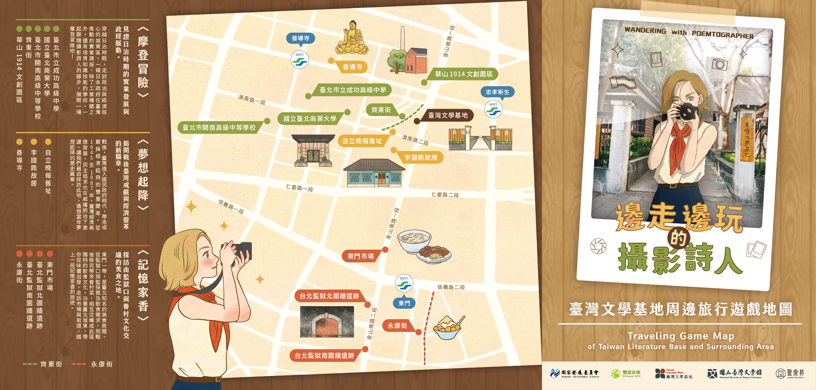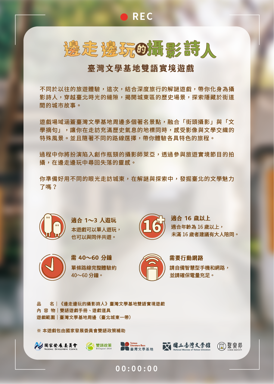 一、依據國立臺灣文學館114年1月24日文學北字第1143000205 號函辦理。 二、國立臺灣文學館臺北分館(臺灣文學基地)位於臺北市濟 南路二段。為推廣英語導覽及「臺灣文學基地雙語實境遊 戲包」,特邀請對英語導覽、文化資產空間及文學走讀有 興趣之學生團體預約參加。 三、預約參加英語導覽者,可獲贈「臺灣文學基地雙語實境遊 戲包」。遊戲包內含解謎遊戲手冊,旨在引導使用者探索 城東地區文化資產,並透過雙語內容融合英語與華語學習 元素。 四、英語導覽預約辦法: (一)團體導覽(10-25人)須於預約日10天前申請。 (二)預約時段:每週二至週日10:00-12:00及13:30-17:00,每場導覽約 30-50 分鐘。 五、申請方式可透過臺灣文學基地官網(https://tlb.nmtl. gov.tw/)填寫申請表並寄至tlb@nmtl.gov.tw。洽詢請聯 繫國立臺灣文學館臺北分館許小姐,電話 02-2327-9657分 機14。 六、檢附本活動相關海報2份。