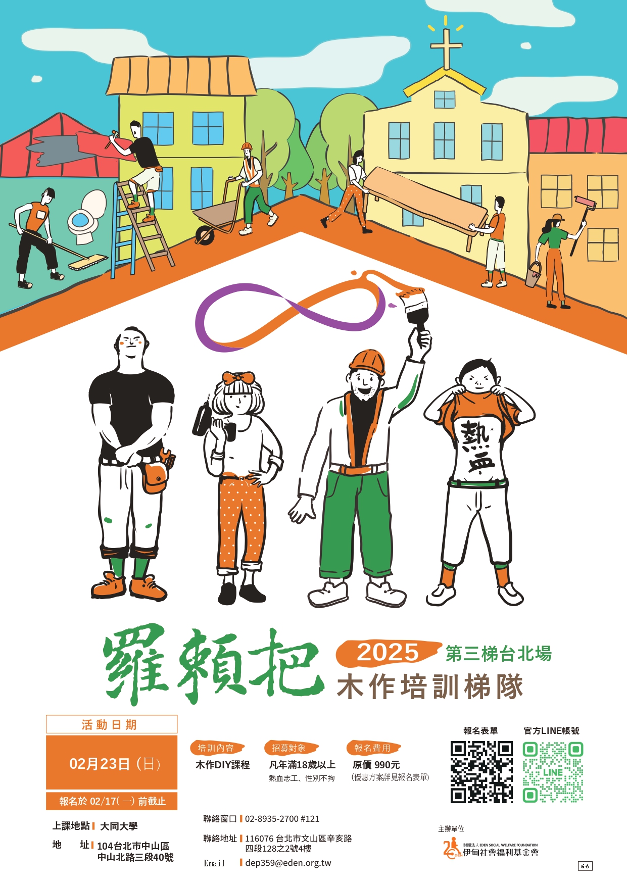 一、財團法人伊甸社會福利基金會於台北大同大學經營大樓辦理「羅賴把志工培訓-第三 梯木作課程」課程。