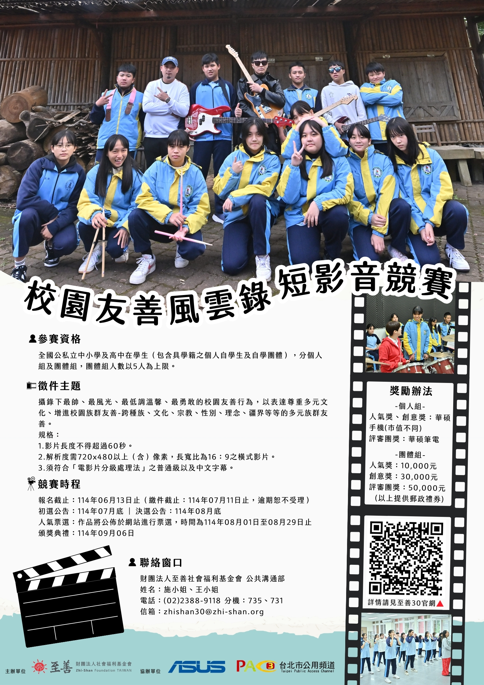 一、依據該法人114年2月20日善字第1140000032號函辦理。 二、該基金會(官網:https://www.zhi-shan.org/)長期從事 亞洲4地兒少發展工作,為響應「兒童權利公約」(CRC) 中禁止歧視原則,自2023年起倡議「校園族群友善」,已 連續兩年舉辦校園族群友善獎。該會將辦理「校園友善風 雲錄-短影音競賽」,邀請全國國小至高中學生共同參 與,促進校園友善。 三、旨揭徵件活動簡章,摘述重點如下: (一)參賽資格:全國公私立中小學及高中在學生(包含具學 籍之個人自學生及自學團體),分個人組及團體組,團 體組人數以5人為上限。(二)報名日期:即日起至114年6月13日前至活動網站 (https://30th-anniversary.zhi-shan.org)填寫相 關 報名資料。 (三)徵件日期:截至114年7月11日止,請將參賽影片上傳 Youtube且設定不公開(知道連結者可觀看),並在活動 網站提供連結及封面縮圖(1280 x 720像素)1張,即完 成繳件。 (四)評選日期:7月底初選公告、8月底決選公告。 四、另本案徵件細則、評審及評分標準、獎勵辦法,詳如活動 簡章及海報說明(詳如附件)。 五、本案若有任何疑問請逕洽該基金會公共溝通部施小姐,電 話:02-2388-9118分機735或王小姐,電話:02-2388- 9118 分機731,信箱:zhishan30@zhi-shan.org。