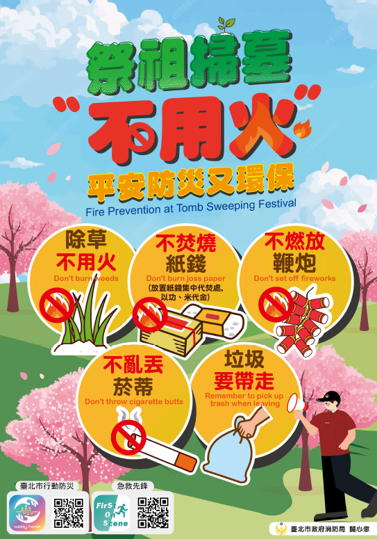 二、請本局所屬各級機關學校(園所)跑馬燈或電子看板,協 助對教職員工生及家長宣導、刊登清明期間掃墓防火宣導 標語或海報,另利用週、朝、班會或各式場合宣導清明期 間掃墓防火知識。