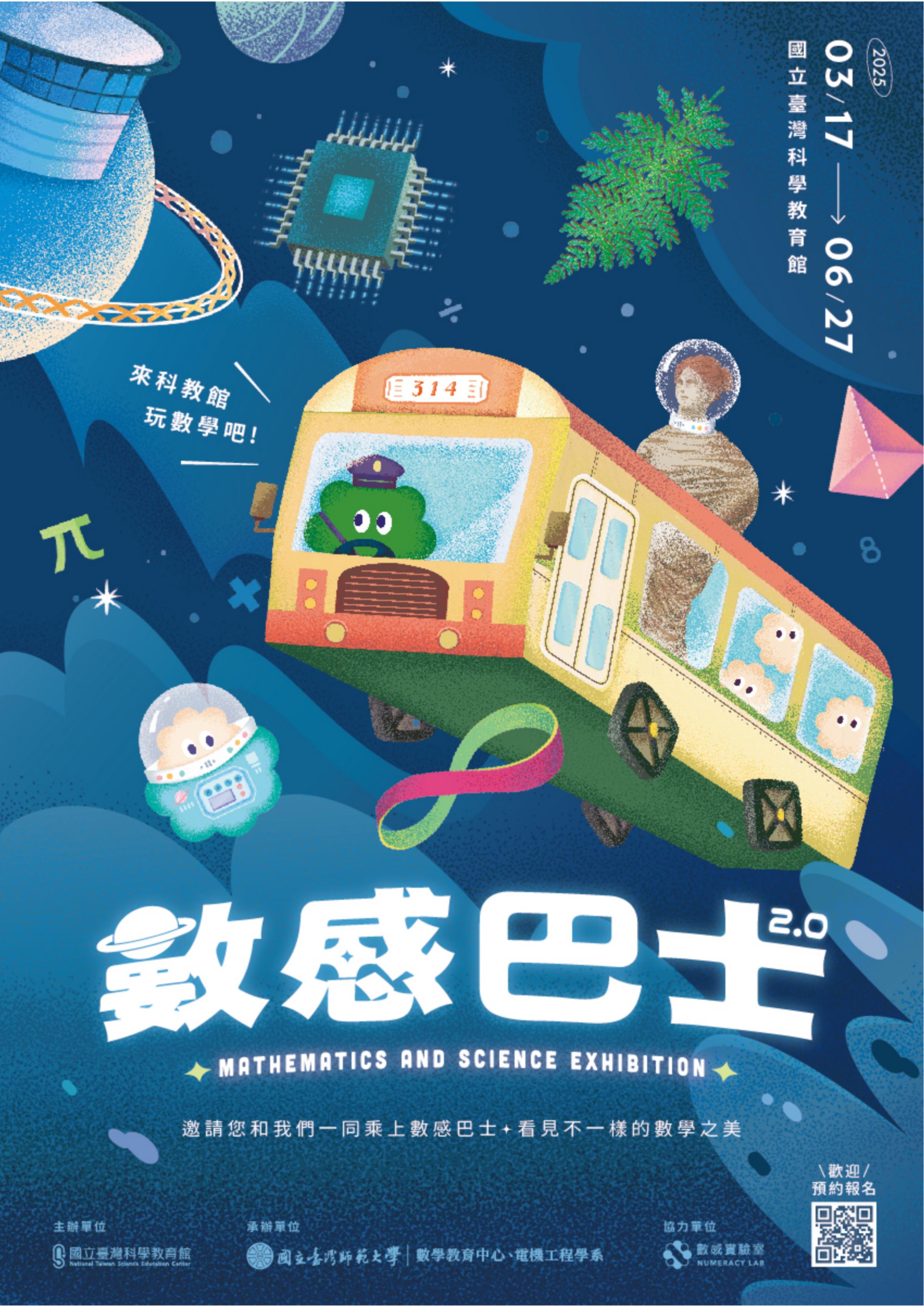 一、旨揭展覽將於114年3月17日(星期一)至6月27日(星期 五)於國立臺灣科學教育館展覽,平日採團體預約制,活 動海報如附件1。 (一)平日開放時間:9時至17時。 1、上午場:9時30分至11時30分。 2、下午場A:13時至15時。 3、下午場B:15時至17時。 (二)校外教學 / 團體導覽限週二至週五,採線上表單方式預 約,詳見附件2,敬請各校師生踴躍報名參加。 二、欲更了解展覽最新動態,歡迎追蹤粉絲專頁「數學巡迴 展」:https://www.facebook.com /MATHtravelingexhibition/;如有任何未盡事宜,請逕洽承辦人詹先生:chiyo@numeracylab.com,或電洽02-2391- 6020#16。