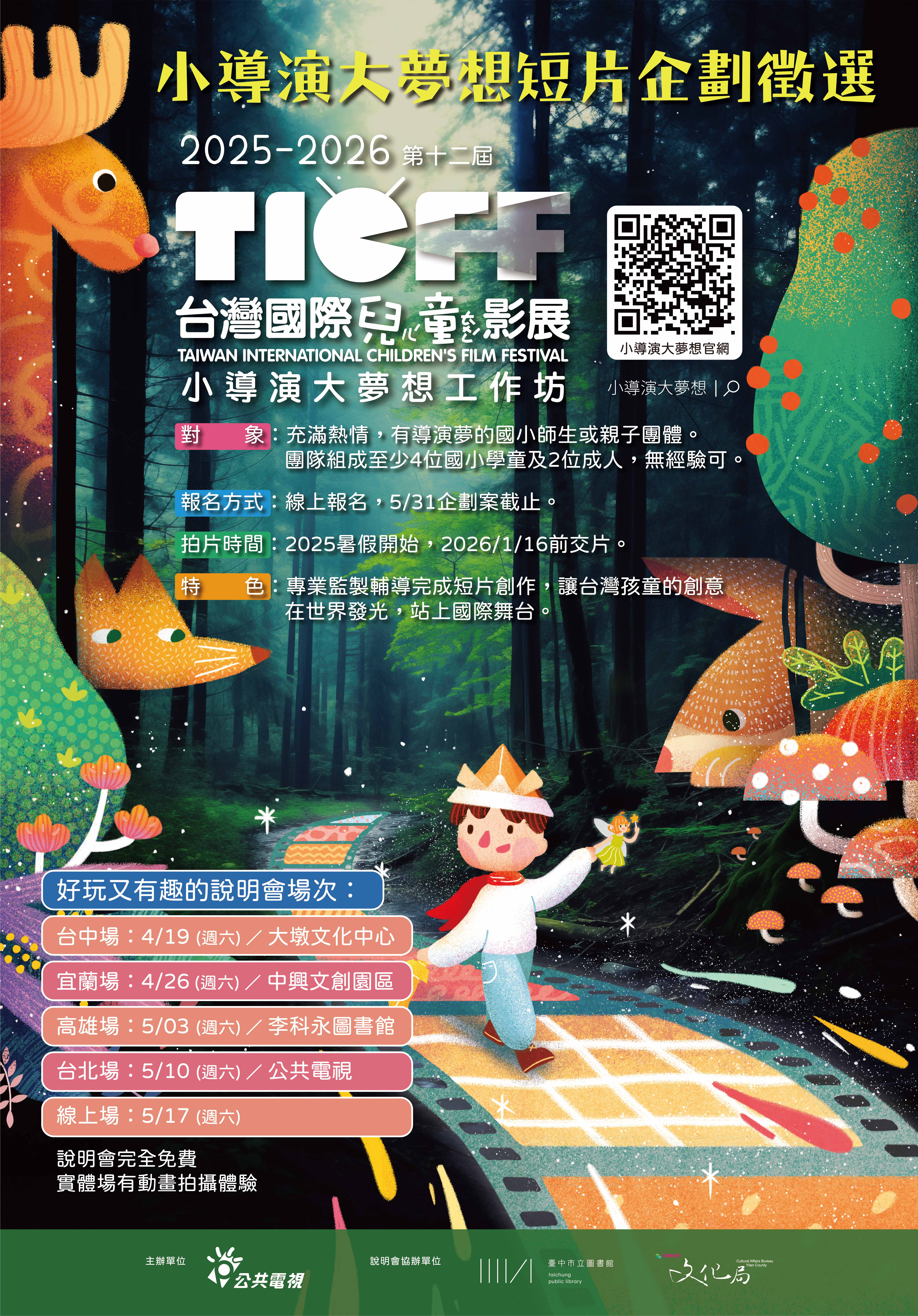 一、公視為推廣兒少影像教育,透過「小導演大夢想工作坊」 兒童影像教育計畫,號召對影像創作感興趣的國小師生、 親子團隊,先徵件再提供培訓輔導的方式,鼓勵組隊參與 短片創作。歷屆經工作坊輔導所完成優質作品在國內外各 大兒童影展屢獲獎勵肯定,讓台灣兒童創意在國際上綻放 光芒。 二、公視2025「小導演大夢想工作坊」即將開跑,本會將舉辦 「短片創作說明會」說明參加辦法及相關活動內容。說明 會場次為2025/4/19台中大墩文化中心、4/26宜蘭中興文創 園區、5/3高雄李科永圖書館、5/10台北公共電視、5/17線上場。邀請專業影像工作者教授拍片企劃案撰寫、及小導 演團隊分享拍片趣事,歡迎踴躍參加。說明會活動全程免 費,請於活動官網線上報名。 三、「兒童短片企劃案徵選」於2025/5/31截止收件,歡迎國小 師生、親子團隊組隊上網報名。提出拍片企劃參加徵選, 入選團隊可享整套拍片輔導資源,完成短片擇優送國際參 展。相關活動細節請上活動官網 https://www.pts.org.tw /dreamer12/
