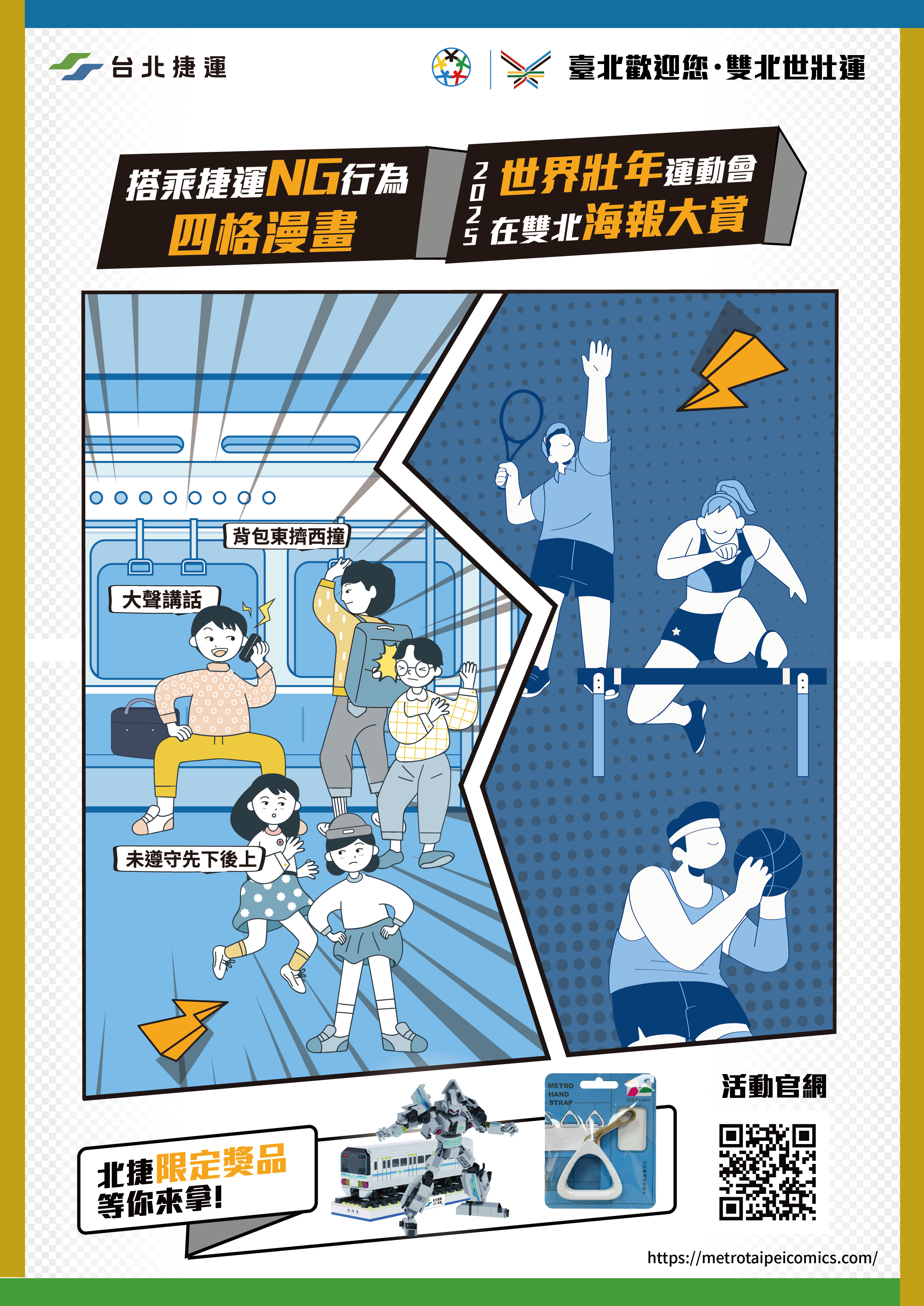 一、依據臺北大眾捷運股份有限公司114年3月19日北捷公字第 1143008433號函辦理。 二、臺北大眾捷運股份有限公司辦理漫畫徵稿活動,期能透過 孩童視角呈現捷運上的NG行為,讓孩童在參與中學習並培 養良好乘車禮儀;另為慶祝雙北市主辦 2025年世界壯年運 動會,同時推出宣傳海報徵選活動,歡迎全民發揮創意, 共襄盛舉。 三、旨揭活動說明如下: (一)活動一:「捷運NG行為四格漫畫徵稿」 1、徵稿對象:全國公私立小學(一~六年級)學生個人 創作。 2、創作主題(擇一):(1)搭車時背包東擠西撞 (2)硬要擋在車門口 (3)上車時亂插隊 (4)未等人下車就往車廂內衝 (5)車廂內大聲講話或觀影音時不戴耳機 3、作品規格:以A4(29.7公分×21公分)規格,橫向呈 現四格漫畫格式,不限傳統手繪或以數位軟體製作。 (二)活動二:「2025年世界壯年運動會在雙北海報徵稿」 1、徵稿對象:不限年齡、職業,所有有興趣製作海報者 均可參加。 2、徵稿內容:以人工智慧、手繪或數位工具創作海報一 張,主題圍繞2025年世界壯年運動會。 3、作品規格:以A3(29.7公分×42公分)直式規格呈 現。 四、為鼓勵活動參與,每個主題選拔優選5名及佳作10名,提供 獎品、奬狀以及展出作品,歡迎有志者踴躍報名。 五、活動全程採線上方式(以LINE帳號登入報名);徵稿時 程:114年3月24日(星期一)起至4月6日(星期日)止。 六、有關報名、活動訊息及其他注意事項,請逕透過活動網頁 查詢。