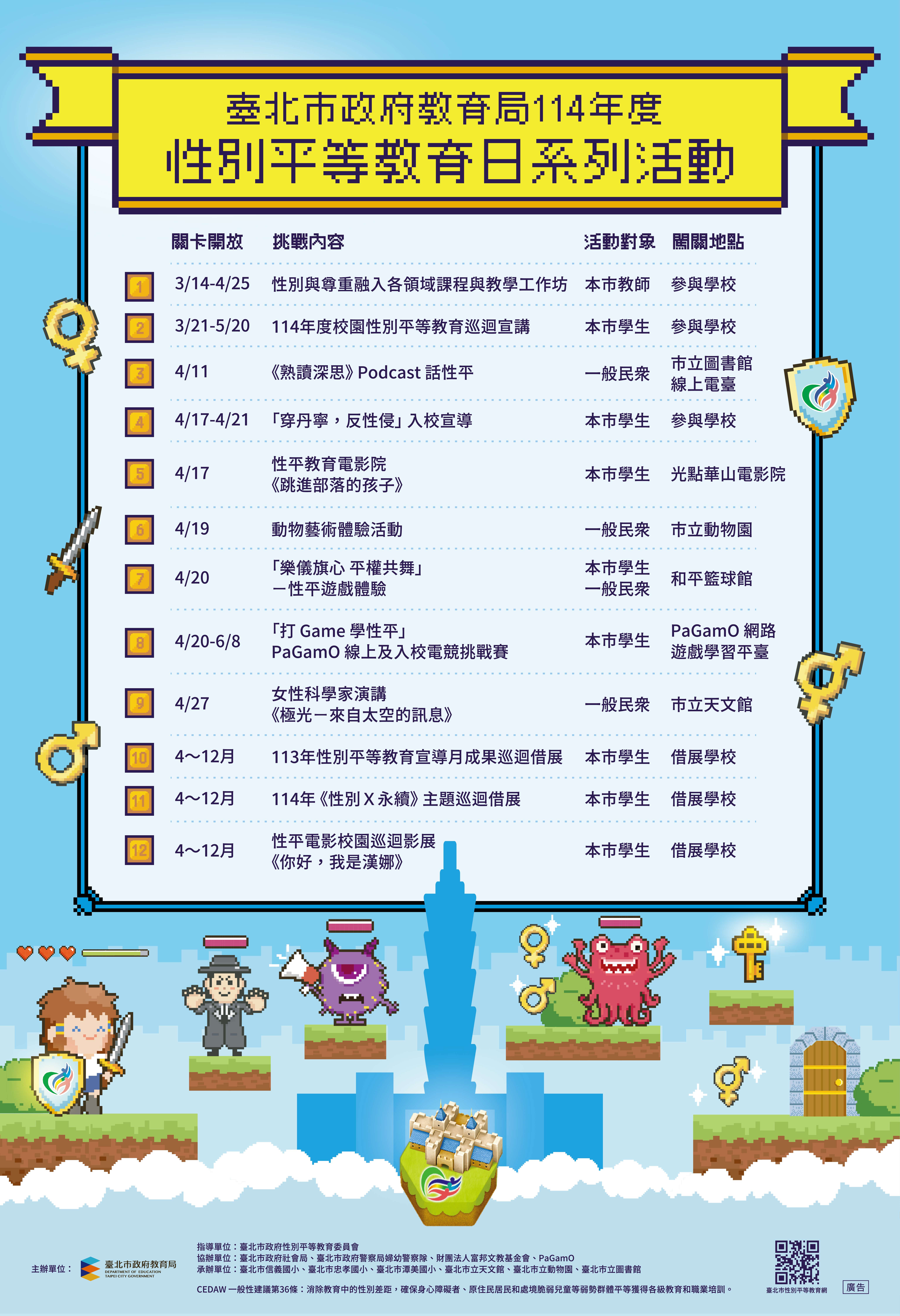 臺北市政府教育局114年度性別平等教育日系列活動,歡迎大家參與!