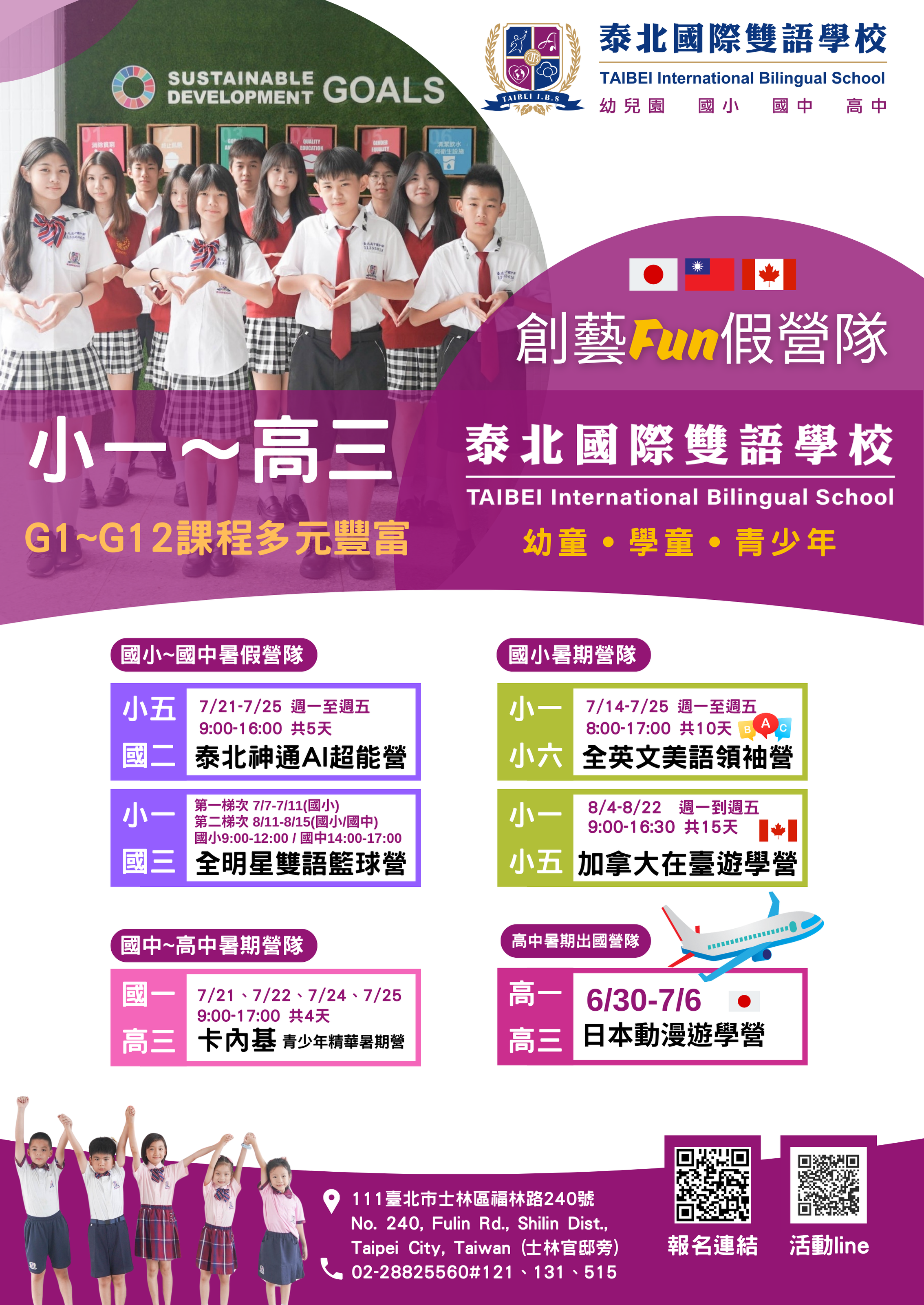 一、本校為提升學生假期學習效益與成人週末充實生活,特規 劃多元營隊與終身學習課程,結合國際教育、科技應用、 藝術素養與身心療癒等主題融入課程。 二、【學生暑期營隊】包含五大主題: 1.泰北神通AI超能營(國小高年級至國中)7/21-7/25 2.卡內基青少年暑期營(國中新生至高中)7/21-7/25 3.全英文美語領袖營(國小全學年)7/14-7/25 4.加拿大在臺遊學營(國小低中年級)8/4-8/22 5.全明星雙語籃球營(國小至國中)7/7-7/11 三、【成人週末學習課程】推出六大主題,鼓勵家長與社區居 民持續學習:1.水墨畫藝班(吳漢宗老師)7/5起每週六為期10週 2.陶藝創作班(吳德賢老師)7/5起每週六為期12週 3.伸展瑜珈班(田儏文教練)7/5起每週六為期8週 4.成人芭蕾與曼妙舞韻班(何孟臻、邱芷琳老師)9月開課 5.藍染藝術創作班(胡桂珠老師)7/12起每週六為期4週 6.AI神器實戰班(卜宇杰老師)5/28 每週三 為期五週 四、課程時間與詳細資訊請參閱官方簡章: 【課程官網】https://reurl.cc/rEd2gr 【報名連結】https://reurl.cc/nra326 五、本校成人班與學生營隊皆設有早鳥優惠,數量有限,額滿 即止,敬請及早報名以保留名額。 六、聯絡方式: 研發室 高主任 02-28825560 分機121、 LINE官方帳號: https://lin.ee/4CIbWBN