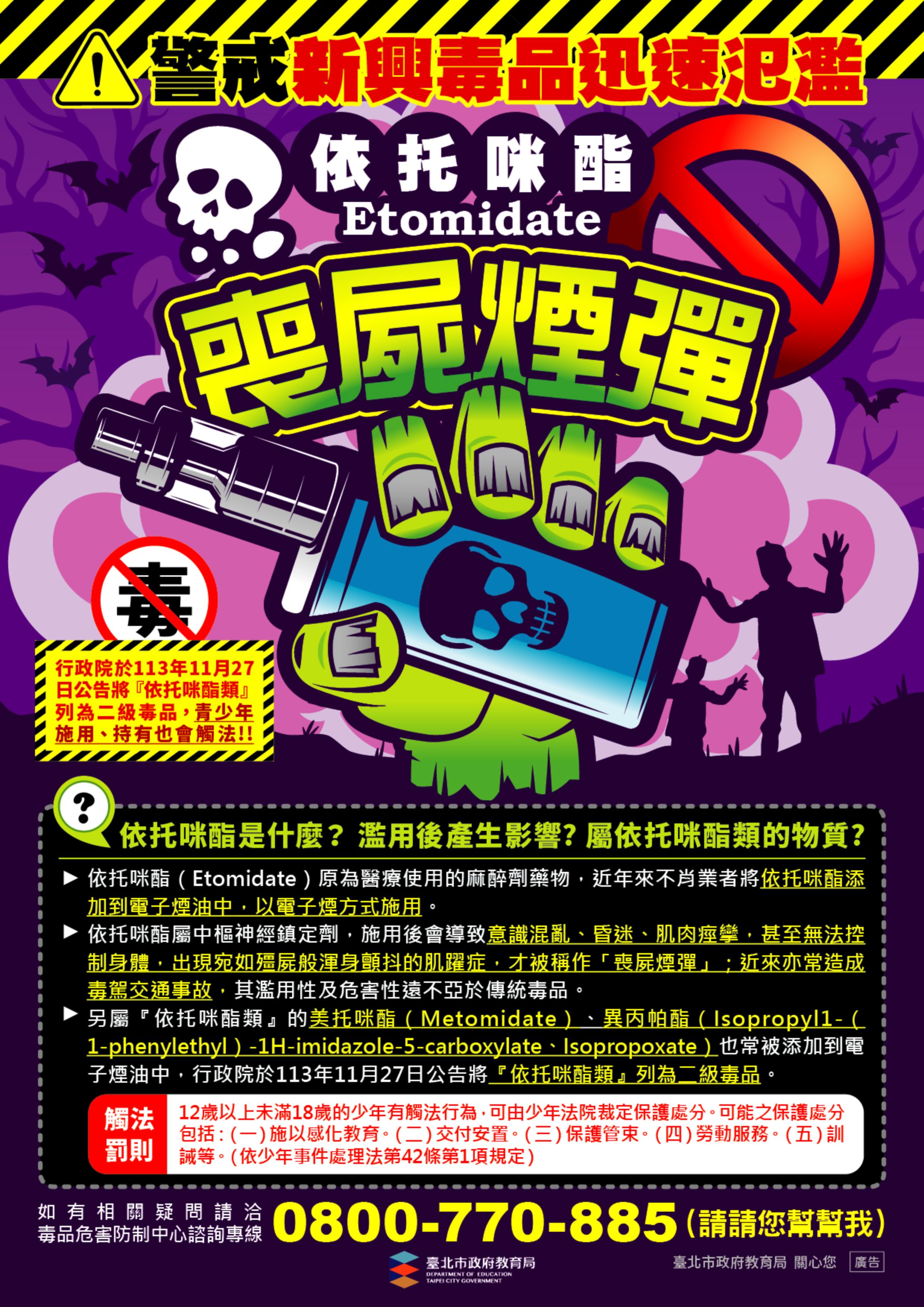 一、依據本局防制學生藥物濫用執行計畫辦理。 二、隨著新興毒品氾濫,依托咪酯(Etomidate)以其易於偽裝 的特性,逐漸成為學生群體中的危險物質,甚至有不肖業 者將其加進電子煙油中,以電子煙方式施用;依托咪酯屬 中樞神經鎮定劑,施用後會導致意識混亂、昏迷、肌肉痙 攣,甚至無法控制身體,出現宛如殭屍般渾身顫抖的肌躍 症,才被稱作「喪屍煙彈」,近來亦常造成毒駕交通事 故,其濫用性及危害性遠不亞於傳統毒品,影響校園安全 甚鉅,行政院於113年11月27日將其列為二級毒品,為了讓 學生遠離毒害,教育局推出針對依托咪酯類毒品的宣導電 子海報(EDM)向教師家長、學生提醒此毒品之危害及相關 罰則,以增強毒品防範意識。 三、請貴校協助宣傳相關資訊並將上開電子海報結合各項研 習、宣導及活動推廣運用,並張貼於適當場所提供學生了解相關訊息。