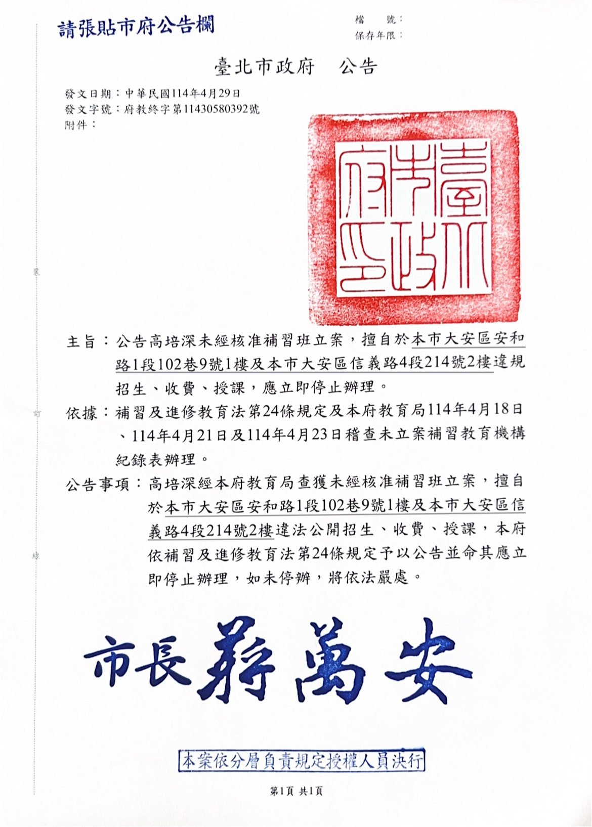 一、依據市府114年4月29日府教終字第11430580392號公告辦 理。 二、高培深經本局查獲未經核准補習班立案,擅自於本市大安 區安和路1段102巷9號1樓及本市大安區信義路4段214號2樓 違法招生收費、授課,經本局依補習及進修教育法第24條 規定裁處及公告,並命其立即停止辦理。 三、高君所涉犯行前經媒體登載,相關新聞請以本名至網路查 詢。為健全補教環境及維護本市學生之權益與安全,請貴 校協助以多元方式公告並轉知學生與家長知悉。