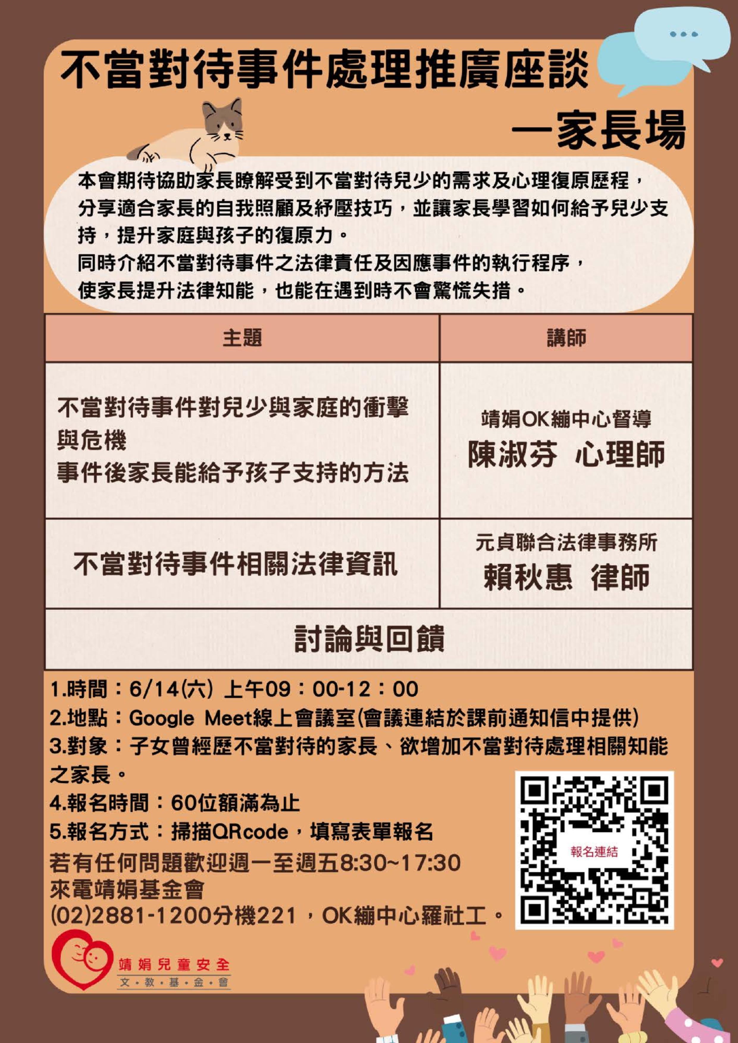 一、依據該基金會114年5月19日114靖娟北總字第1140000206號 函辦理。 二、該基金會期待以座談的方式與家長分享受到不當對待兒少 的需求、心理復原歷程及適合家長的自我照顧、紓壓技 巧,並讓家長學習如何給予兒少支持,提升家庭與孩子的 復原力。同時介紹不當對待事件之法律責任及因應事件的 執行程序,使家長提升法律知能,也能在遇到時不會驚慌 失措。 三、檢送「不當對待事件處理推廣座談—家長場」單張1份供參 (如附件),如家長對活動詳細資訊有疑問,可逕洽OK繃中心羅社工,2881-1200分機221。
