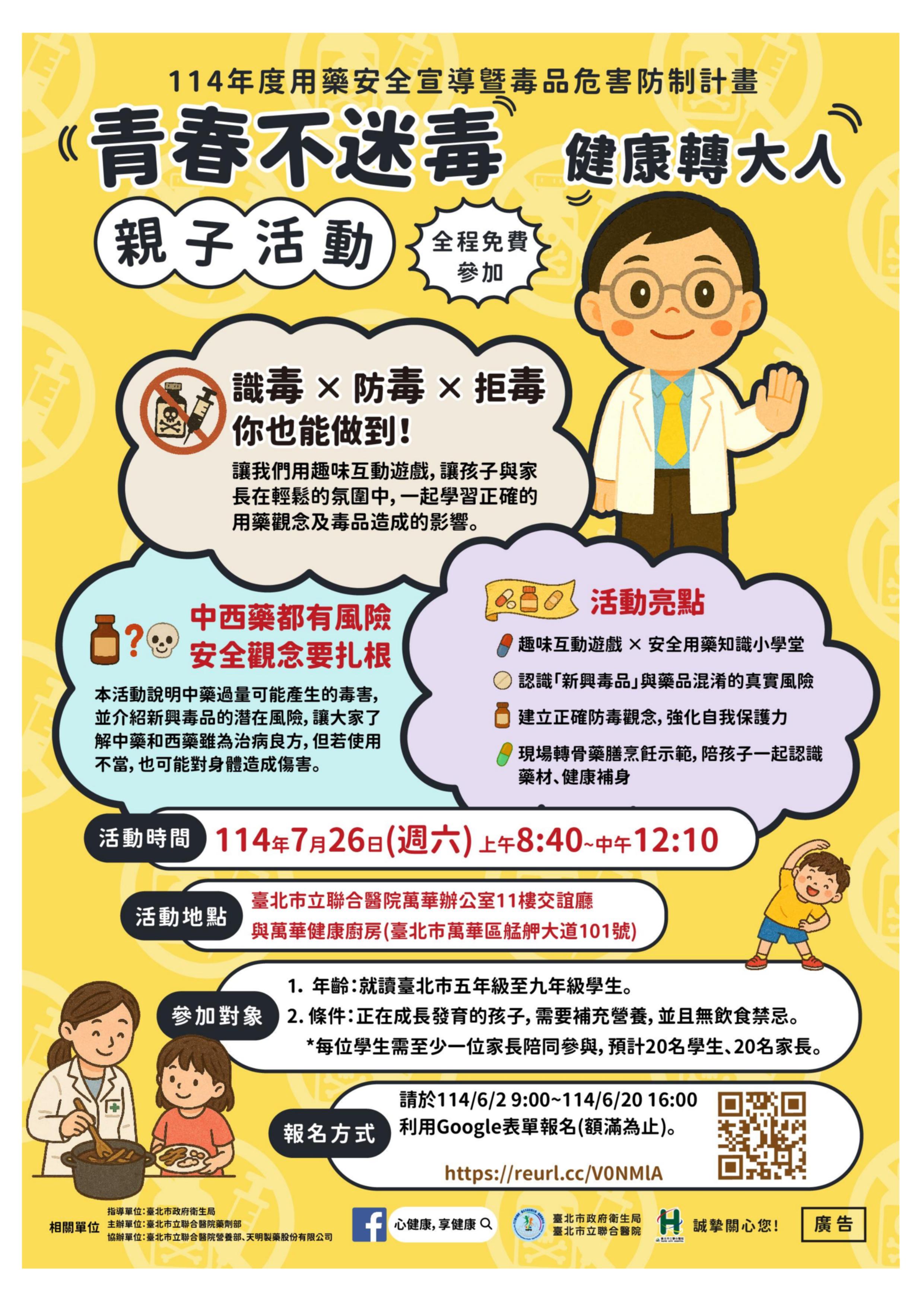 一、依據本市聯合醫院114年5月13日北市醫藥字第1143029746 號函辦理。 二、為推廣「用藥安全知識及毒品防制」正確觀念,敬邀本市 五年級至九年級學生及家長參與,藉由活動引導加強民眾 用藥安全及毒品危害防制藥物濫用之觀念,特於暑期辦理 親子活動,希望提升未成年學子對於反毒以及藥物濫用之 重要性,進一步提升健康識能(活動辦法如附件1、活動海 報如附件2)。 三、活動資訊如下: (一)活動時間:114年7月26日(星期六)上午8時40分至中 午12時10分。 (二)活動地點:臺北市立聯合醫院萬華辦公室11樓交誼廳與萬華健康廚房(臺北市萬華區艋舺大道101號)。 (三)報名時間:請於114年6月2日上午9時至114年6月20日下 午4時利用Google表單報名(額滿為止)。 (四)線上報名網址:https://reurl.cc/V0NMlA。 四、請詳閱活動辦法,若有相關疑問或需求,請逕洽活動聯絡 窗口:臺北市立 聯合醫院藥劑部高小姐,電話:(02) 25553000分機 2298,電子信箱:A3666@tpech.gov.tw。
