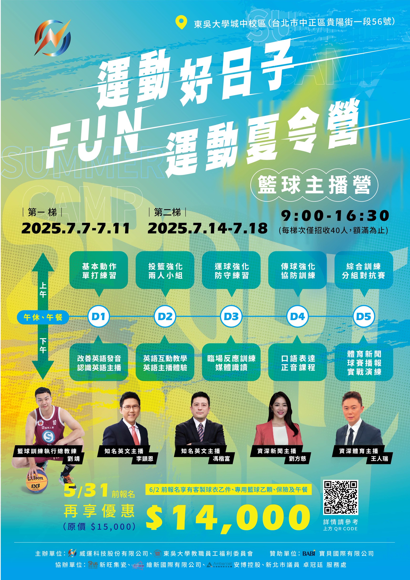 一、本次共計招生九個研習營:Roblox銀河英雄營、邏輯桌遊 與星靈王卡牌對戰、益智魔術科幻營、暑期桌球營下午班 第一期、 假羽球營上午班第一 、Roblox 競技場大師營、 暑期桌球營下午班第二 、暑假羽球營上午班第二 、 籃球 主播營 。 二、研習營於2025年6月28日前報名享優惠價,額滿即止。 三、課程網址https://www.ext.scu.edu.tw/courses3.php? cid=57c0010f-dcef-11e8-8f6e-000c29ad6982#search