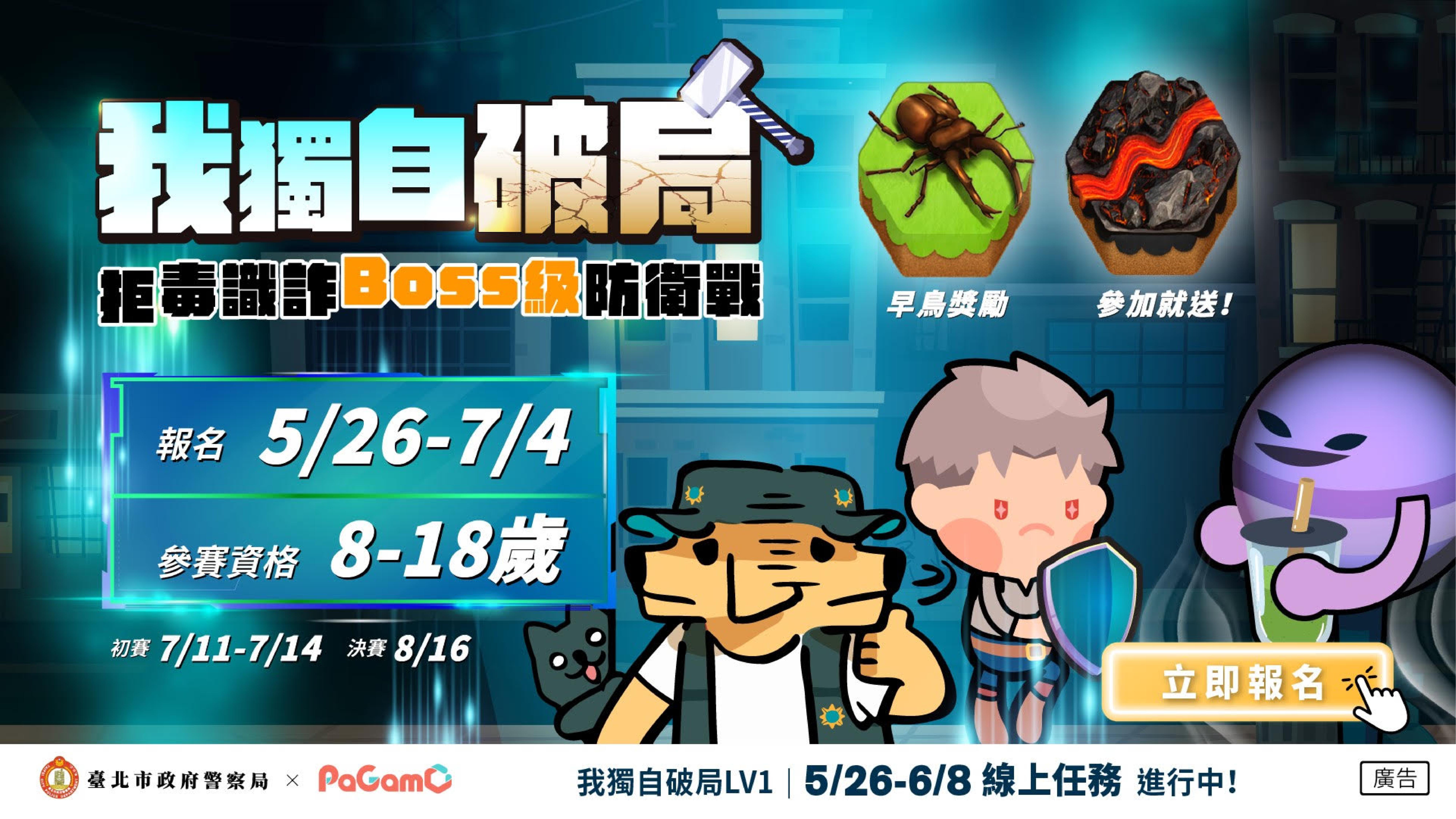一、依據本府警察局114年5月26日北市警少字第1143012966號 函辦理。 二、為強化兒少拒毒、識詐觀念,本府警察局114年(下同)結 合PaGamO遊戲化平臺推出「我獨自破局:拒毒識詐Boss級 防衛戰」 活動,透過遊戲化及情境式方式,促進其自主學 習,強化 法治觀念及自我保護知能。 三、旨揭活動資訊摘述如下: (一)問答任務 1、第一波:即日起至6月8日(星期日)止。 2、第二波:6月30日(星期一)至7月13日(星期日) 止。 (二)電競賽1、報名日期:即日起至7月4日(星期五)12時止。 2、初賽日期:7月11日(星期五)12時起至7月14日(星 期一)21時止。 3、決賽日期:8月16日(星期六)。 4、報名資格:全國8至18歲兒少。 四、活動報名網址:https://esports.pagamo.org /register /2025tcpd_antifraud_drug/information 五、檢送「我獨自破局:拒毒識詐Boss級防衛戰」電競賽活動 報名簡章、操作手冊及活動海報各1份。 六、若有相關疑問或需求,請逕洽活動聯絡窗口: (一)聯絡電話:(02)33931663分機251殷小姐、(02) 33931663分機261葉先生。 (二)電競賽用客服信箱:esport@pagamo.org