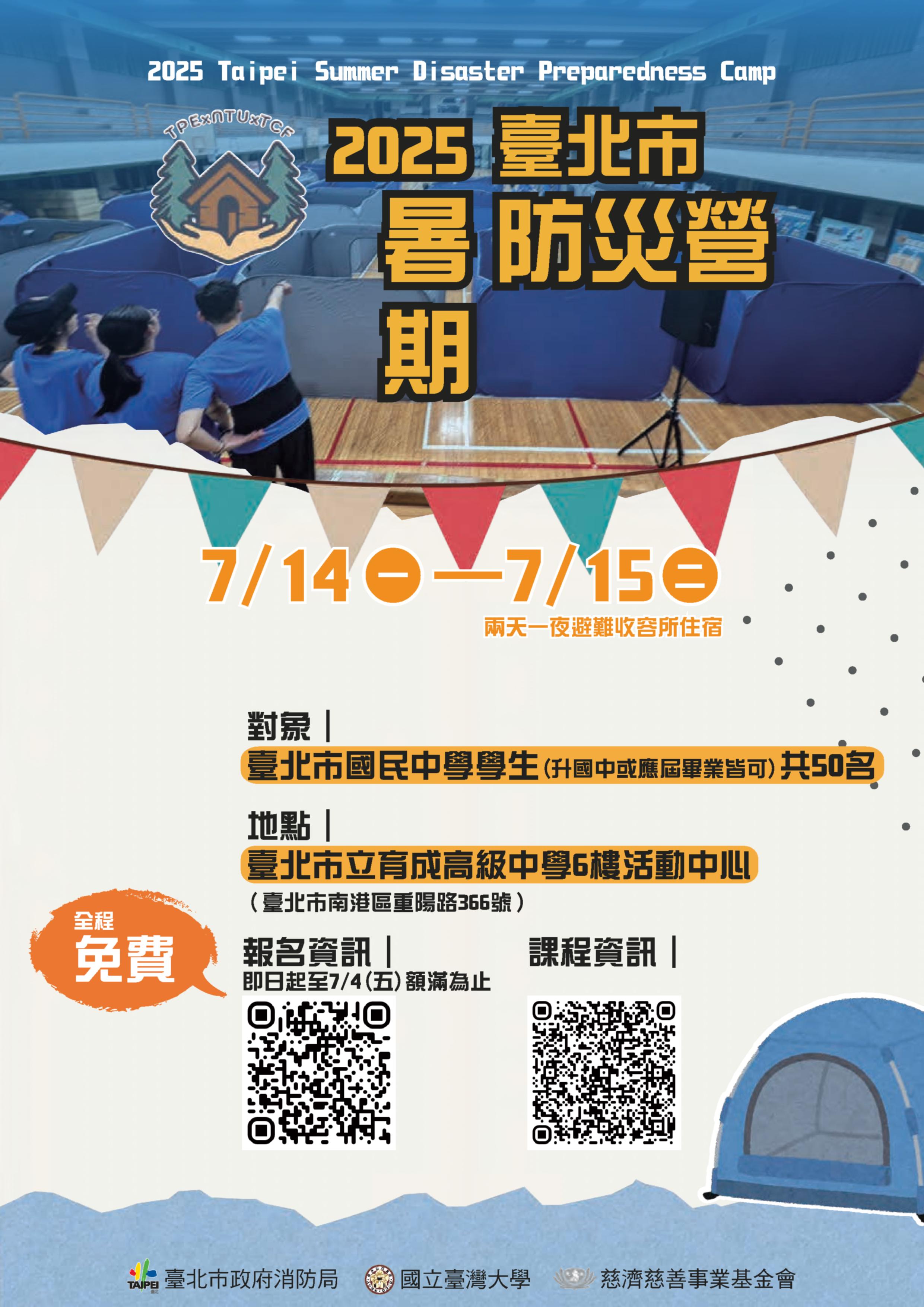 一、依據國立臺灣大學114年6月3日校天災研字第1140049615號 函辦理。 二、旨案為提升本市國中學生防災意識與實務應變能力,透過 營隊活動強化防災教育與社會責任,訂於114年7月14日 (星期一)至15日(星期二)假臺北市立育成高級中學6樓 活動中心辦理,招生對象為本市國民中學學生(小學升國 中或國中應屆畢業皆可),共計50名。 三、報名期限至114年7月4日(星期五)額滿為止,採網路報名 方式(網址:https://reurl.cc/DqMerm)。 四、檢附招生海報及活動計畫書各1份,敬請貴校協助轉知所 屬,鼓勵學生踴躍報名參與。五、活動承辦人及聯繫方式: (一)活動主聯絡人:徐阡育。 (二)活動主聯絡人電話:(02)3366-2614#31。 (三)活動主聯絡人電子信箱:onlye932167@gmail.com。 (四)本市防災教育輔導團—防災基地學校推廣教育中心(市 立萬芳高級中學)賴家榮;02—22309585轉400。