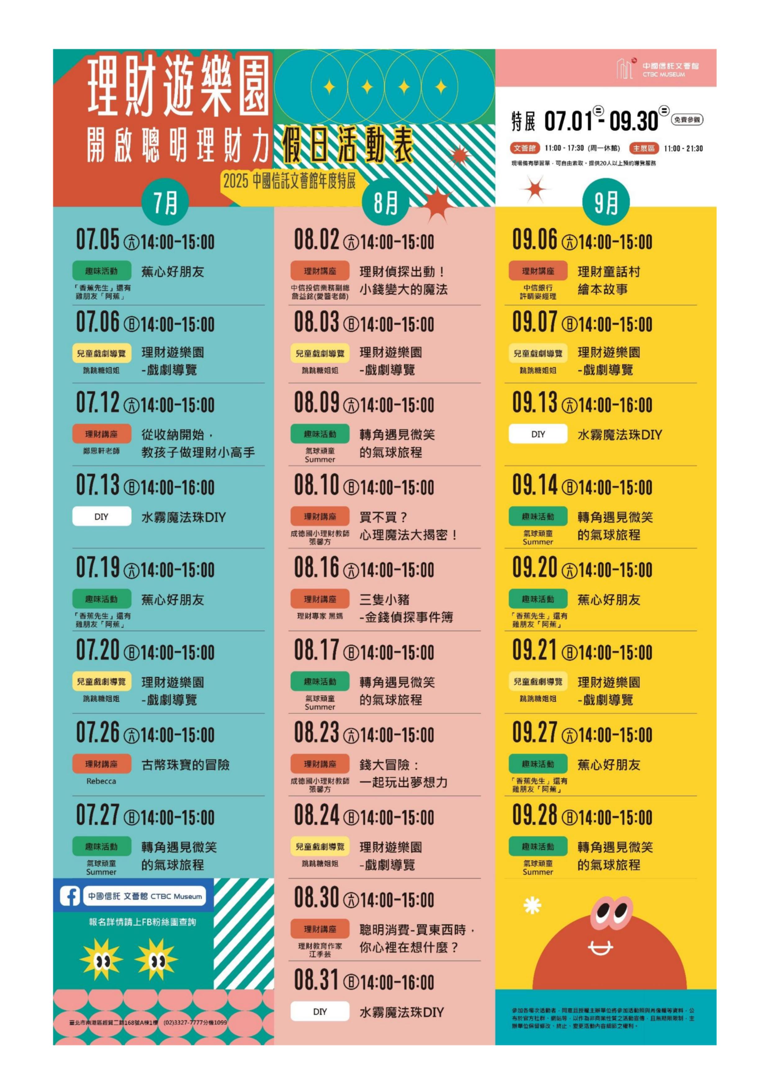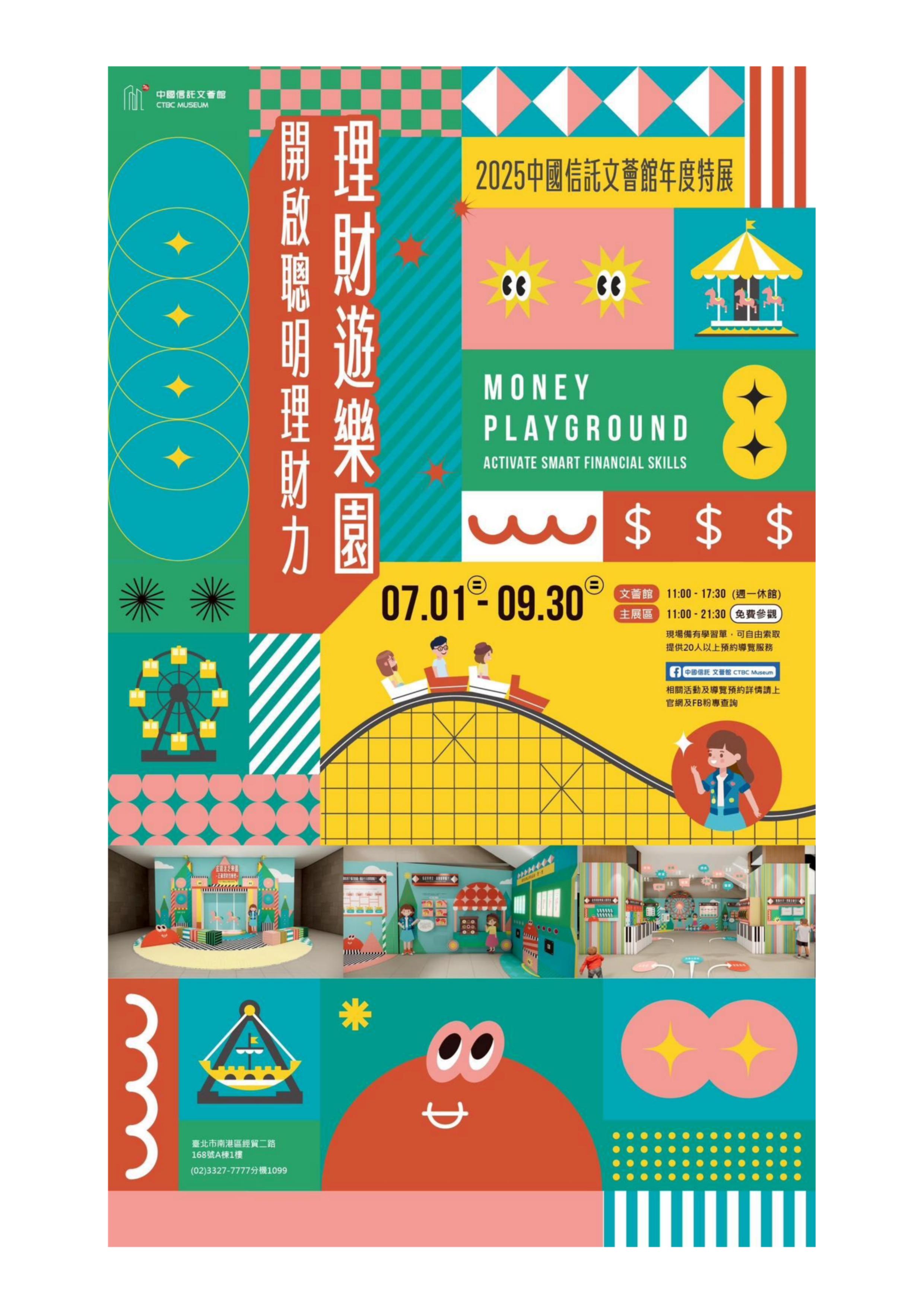 一、依據中國信託商業銀行股份有限公司114年6月11日中信銀 字第1142020885號函辦理。 二、旨揭展覽相關資訊: (一)時間:【特展區】114年7月1日至9月30日,每日11時至 21時30分;【常設展區】全年每週二至週日11時至17時 30分(每週一及農曆除夕至初二休館)。 (二)地點:中國信託金融園區文薈館(臺北市南港區經貿二 路168號A棟1樓)。 (三)特展簡介:金錢不只是交易工具,也是理財籌碼,更是 照見我們選擇、情緒與價值觀的鏡子。本次特展規劃三 大主題:零用錢使用、消費心理、詐騙心理,引領參觀者思考我們與金錢的關係。故事從主角領到零用錢的那 一天展開,現實生活中有各種金錢選擇,是否會受到情 緒、銷售話術、詐騙陷阱影響?展場設計多種理財遊 戲、心理測驗等,同時也提供學習單自主學習,幫助大 家找到適合自己的理財方式。暑假期間周末假日安排有 趣課程和遊戲活動,包含親子理財講座,亦有戲劇導 覽、DIY手作課程及表演等,適合師生及親子共學,陪孩 子們快樂放暑假。凡於特展期間完成指定任務者,可獲 得特展限定精美小禮。 (四)常設展簡介:文薈館為臺灣金融業第一所結合多媒體互 動劇場、AR/VR沉浸體驗、理財遊戲模擬等設計展示的金 融文史館,除可了解臺灣金融業發展歷史、生活化金融 知識,亦可在168Studio了解創新金融科技趨勢,包括自 製專屬3D數位分身,身歷其境體驗虛擬分行中之金融互 動。最新生成式AI技術製作「AI客戶助理」、「AI智能 嚮導」可體驗擬真人互動之個人化服務。 (五)歡迎社會大眾於開館期間自由參觀,教育工作者帶團 20 人以上可預約申請專人導覽。 三、如有相關問題,請逕洽聯絡人:朱仲苓小姐,電話:02- 33277777 分機6633。
