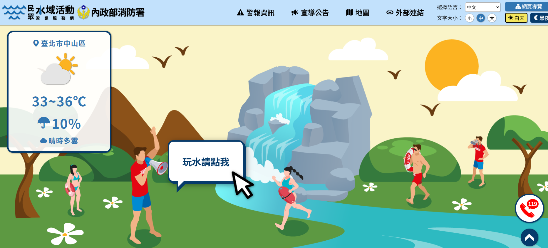 內政部消防署業透過優化既有系統,進一步將過往歷史案 件的大數據統計分析結果加值應用,並於113年度完成建置 「民眾水域活動資訊服務網頁」,歡迎大家多加利用。※網頁連結: https://watersafe.nfa.gov.tw/watersafe/