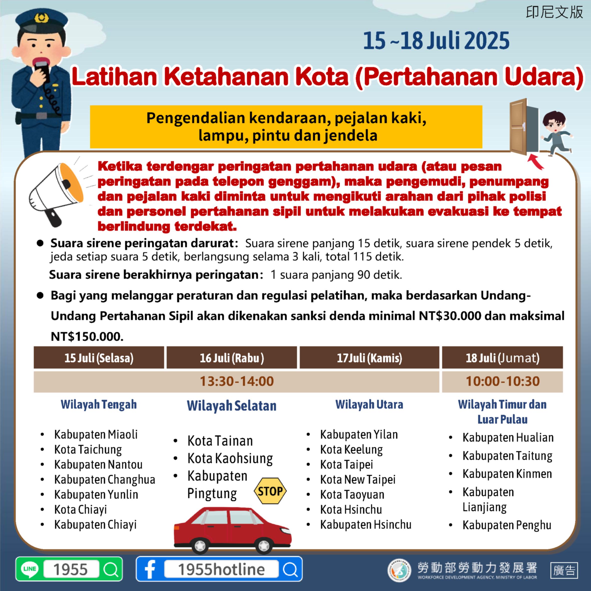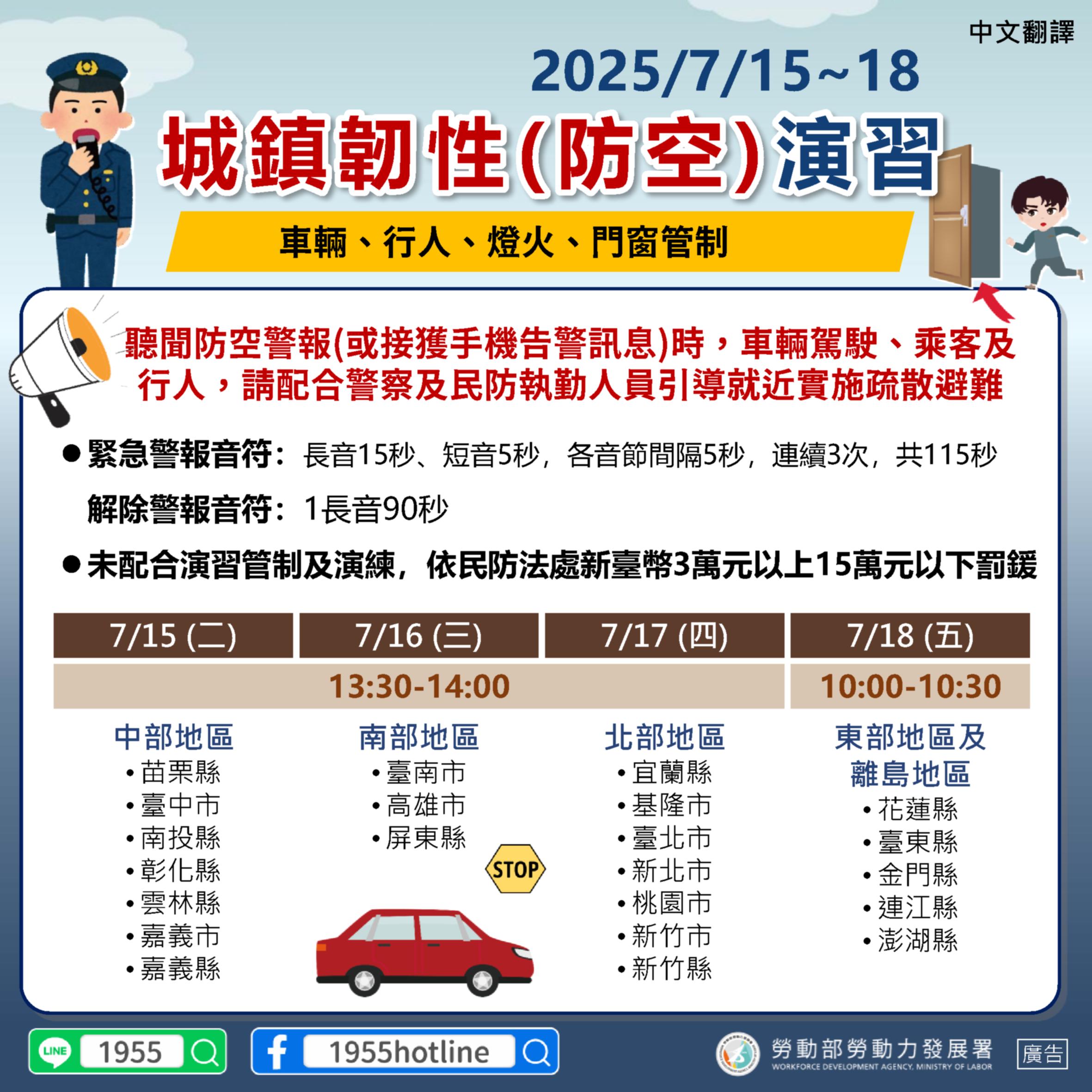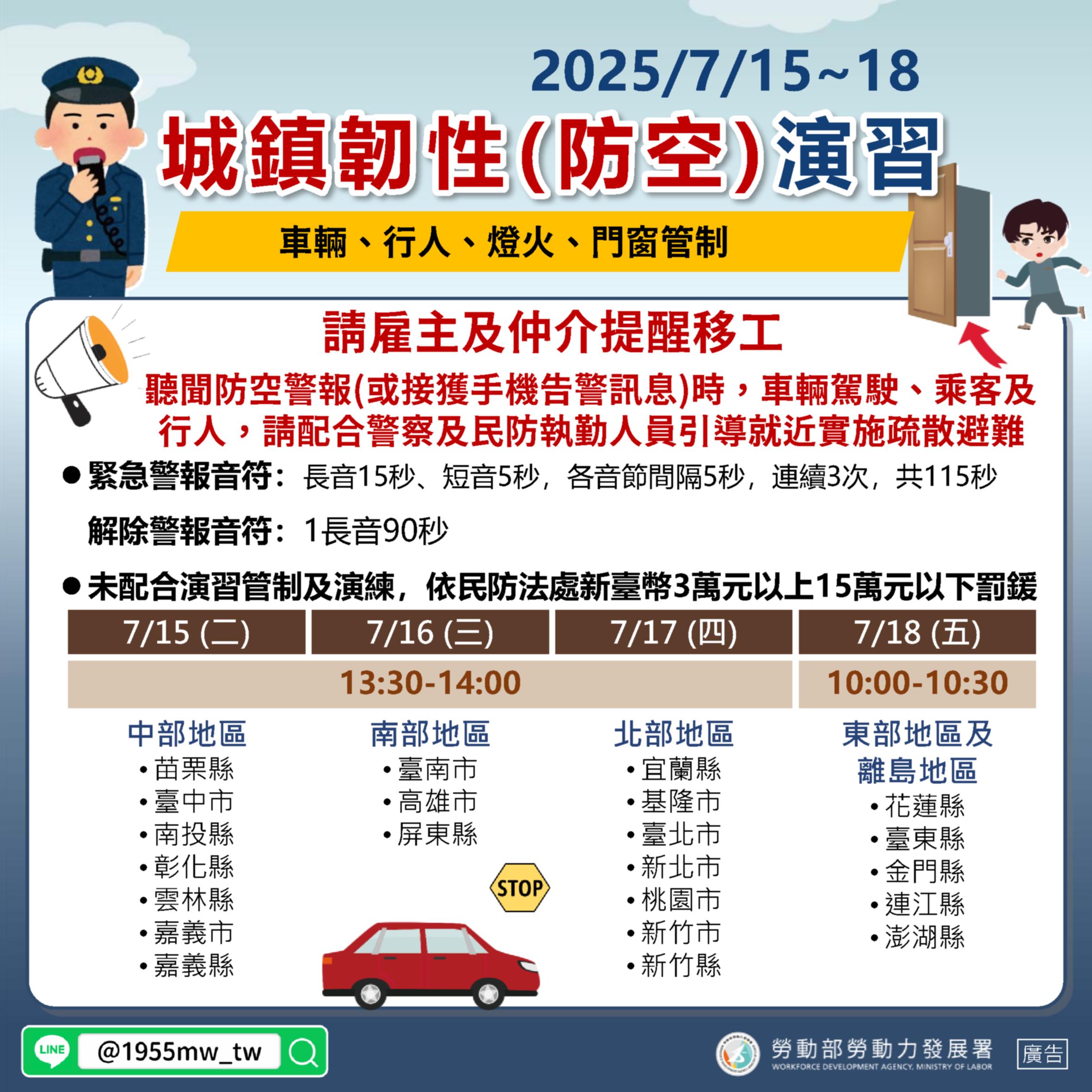 一、依據本市勞動力重建運用處114年7月15日北市勞運檢字第 1143052029號函辦理。 二、本局前於114年6月10日北市教秘字第1143069652號函(諒 達)請協助宣導「2025城鎮韌性(防空演習)」多國語言 文宣資料。 三、勞動力發展署另就本年度演習製作114年「2025城鎮韌性 (防空演習)」多國語文宣素材,建請搭配相關文宣使 用,向本市外國人宣導演習訊息。