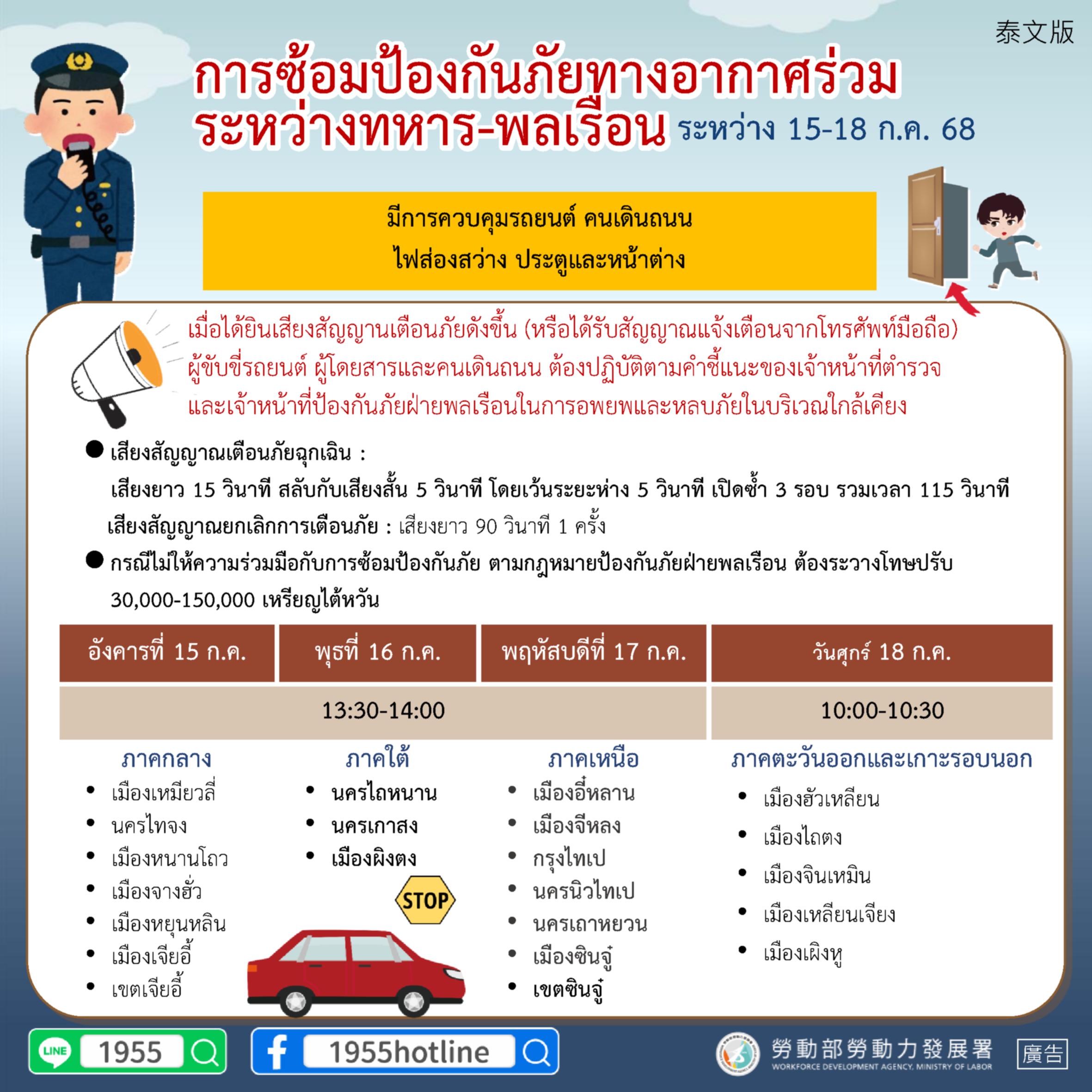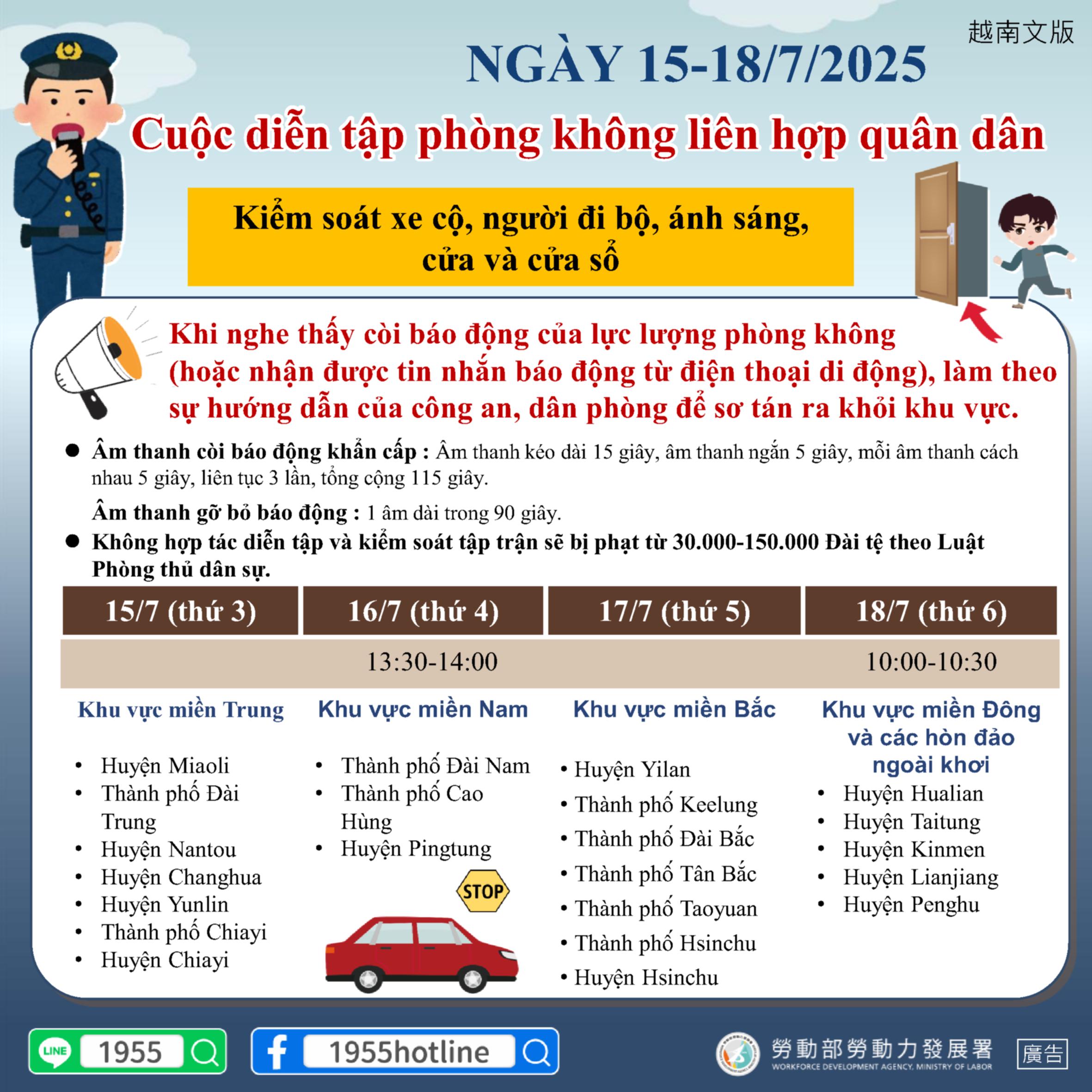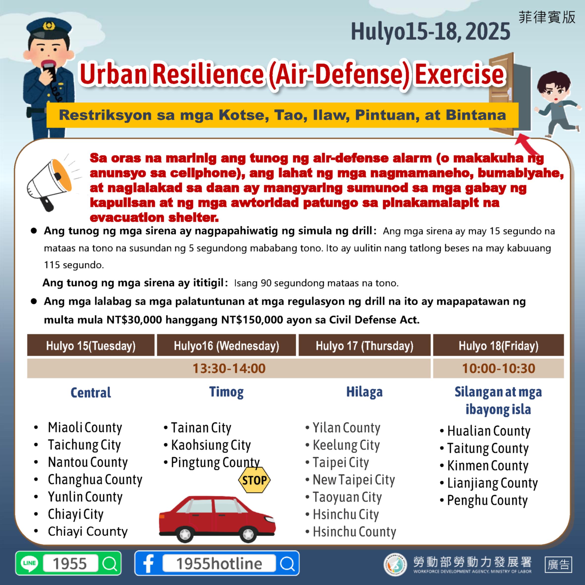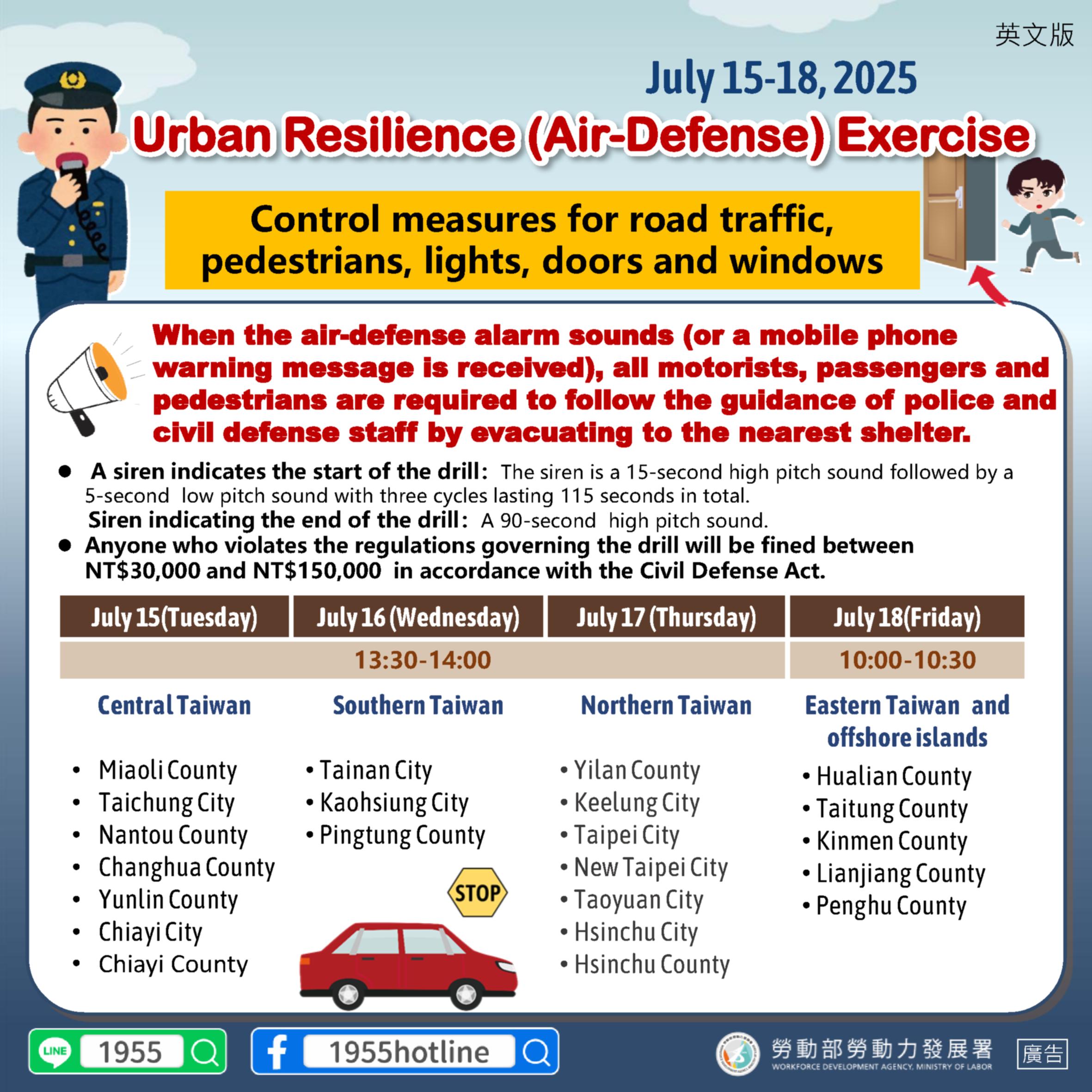 一、依據本市勞動力重建運用處114年7月15日北市勞運檢字第 1143052029號函辦理。 二、本局前於114年6月10日北市教秘字第1143069652號函(諒 達)請協助宣導「2025城鎮韌性(防空演習)」多國語言 文宣資料。 三、勞動力發展署另就本年度演習製作114年「2025城鎮韌性 (防空演習)」多國語文宣素材,建請搭配相關文宣使 用,向本市外國人宣導演習訊息。