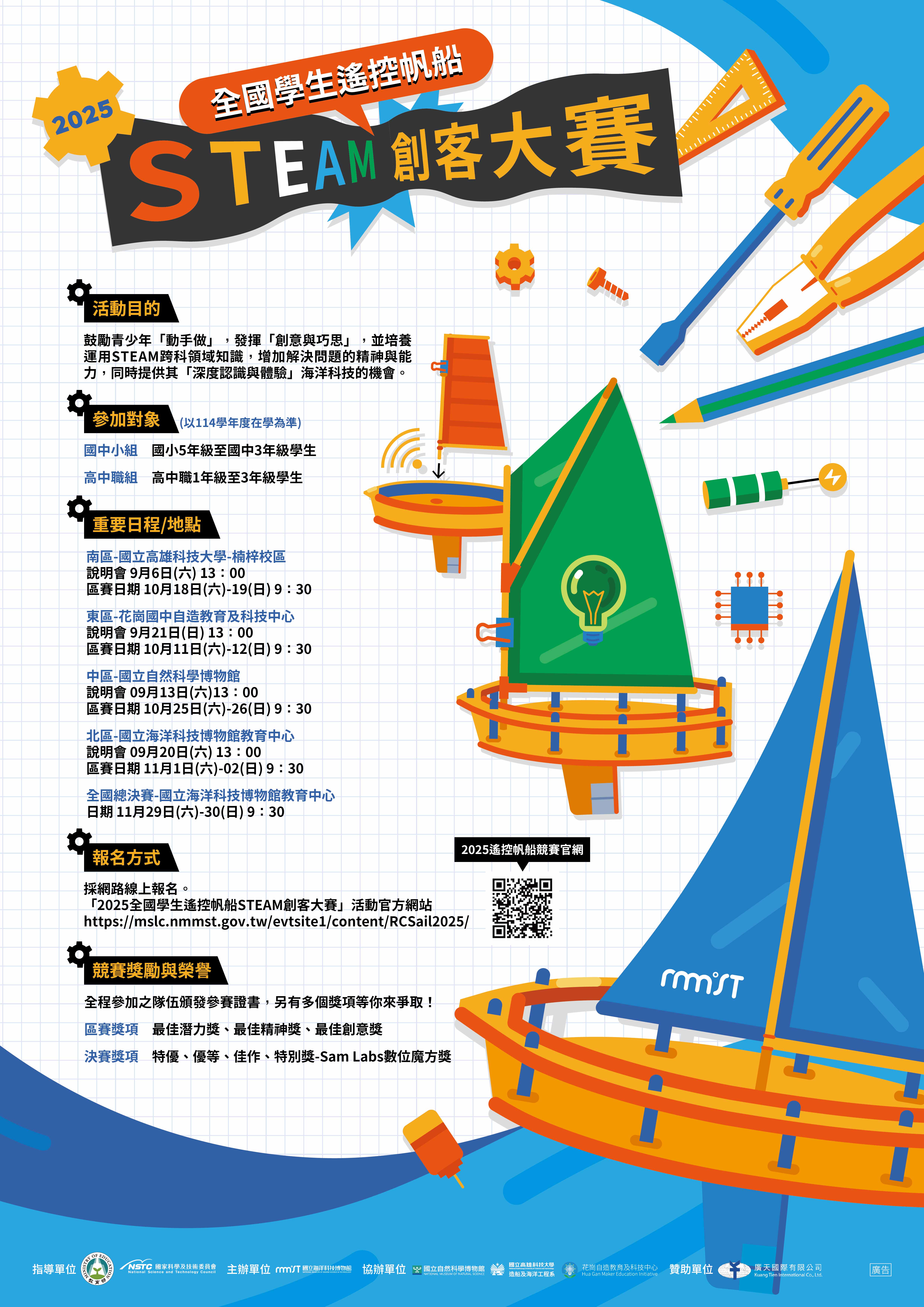 四、活動詳情與報名請參閱活動簡章,或至「2025全國學生遙控帆船STEAM創客大賽」活動官網