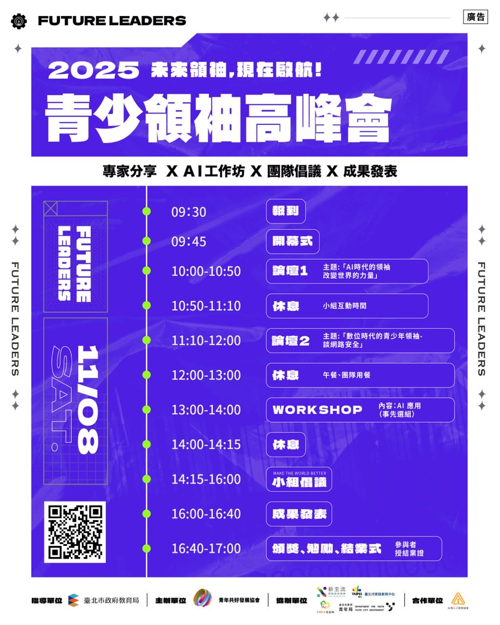 一、依據財團法人臺北市青年共好發展協會114年8月28日共好 字20250828號函辦理。 二、旨揭活動旨在引導少年瞭解AI趨勢,提升社會與國際視野 並協助孩子找到自我價值、穩健成長。相關報名資訊如下 (一)參加對象:11至16歲之在學學生。 (二)時間:114年11月8日(星期六)上午9時45分至下午5 時。 (三)地點:臺北市政府青年局6樓國際會議廳。 (四)報名期限:即日起至10月27日(額滿為止)。 (五)報名網址:https://reurl.cc/WOZ9b9 三、本活動報名相關事宜,請逕洽臺北市青年共好發展協會林先生,聯絡電話:0932-011433,聯絡信箱: Nskids2014@gmail.com。