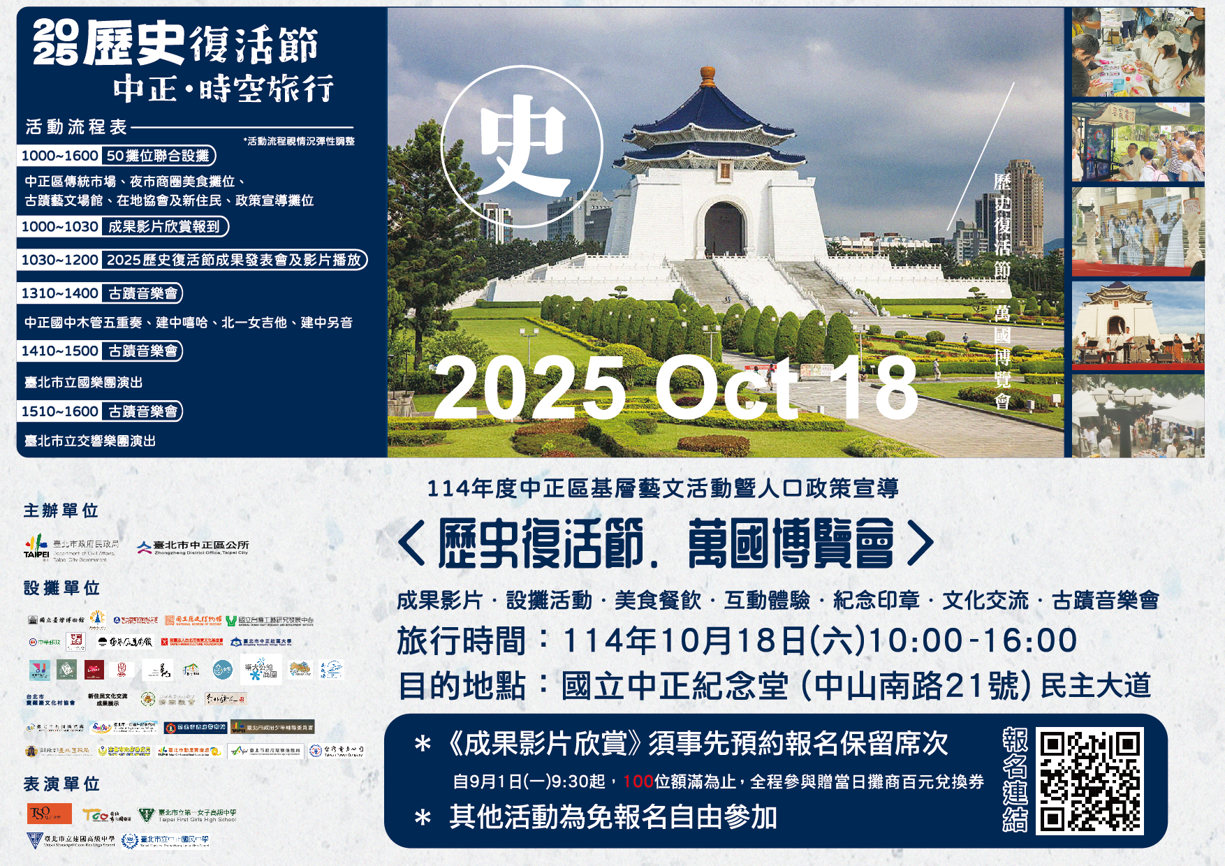 一、本區114年度基層藝文活動「2025歷史復活節:萬國博覽 會」將於114年10月18日(星期六)上午10時至下午4時假 中正紀念堂(中山南路21號)堂體前民主大道舉辦。