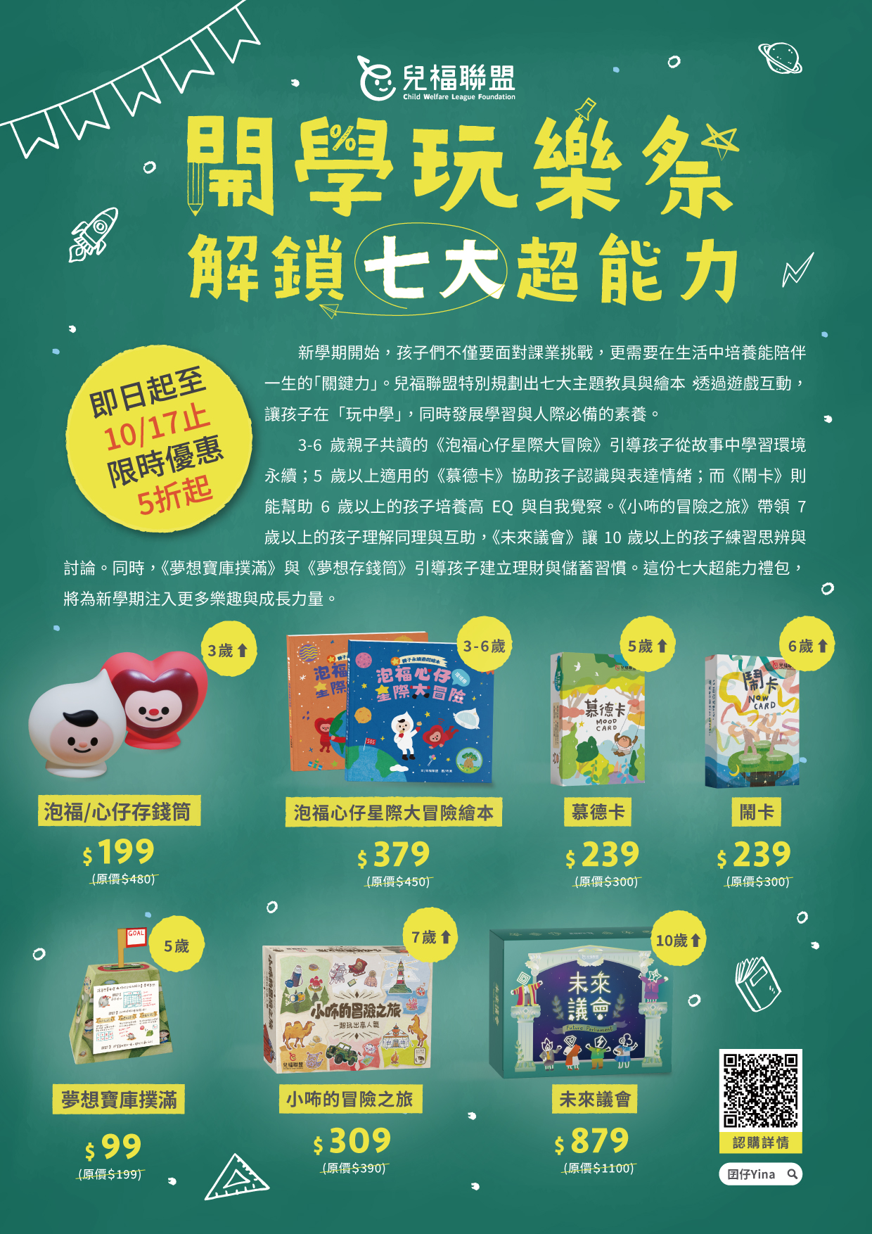 一、本會長期關注兒少身心發展,為協助孩子在新學期能兼顧 知識學習與生活素養,特規劃「開學玩樂祭·解鎖七大超能 力」成長禮包,透過繪本、桌遊及互動工具,引導孩子在 遊戲中培養未來關鍵能力。 二、禮包內容涵蓋不同年齡層適用教材,說明如下: (一)《泡福心仔星際大冒險》:適合3-6歲親子共讀,培養永 續力。 (二)《慕德卡》:適合5歲以上,協助認識與表達情緒,培養 表達力。 (三)《鬧卡》:適合6歲以上,提升情緒管理與自我覺察,強 化高EQ。 (四)《小咘的冒險之旅》:適合7歲以上,增進同理心與人際互動力。 (五)《未來議會》:適合10歲以上,透過討論與辯證鍛鍊思 辨力。 (六)《夢想寶庫撲滿》:建立理財觀念,培養理財力。 (七)《夢想存錢筒》:養成儲蓄習慣,提升儲蓄力。 三、本活動旨在推廣寓教於樂的學習方式,期盼透過師長引導 與校園推廣,協助孩子在遊戲中探索自我、培養能力,迎 接新學期的學習與生活挑戰。 四、隨函檢附活動簡介電子檔,惠請 貴校協助公告,並鼓勵 師生參與,以支持兒少多元教育推動。活動網址: https://pse.is/86n9ku。 五、如有未盡事宜,請洽本會資發組李小姐,連絡電話:02- 27990333分機689。