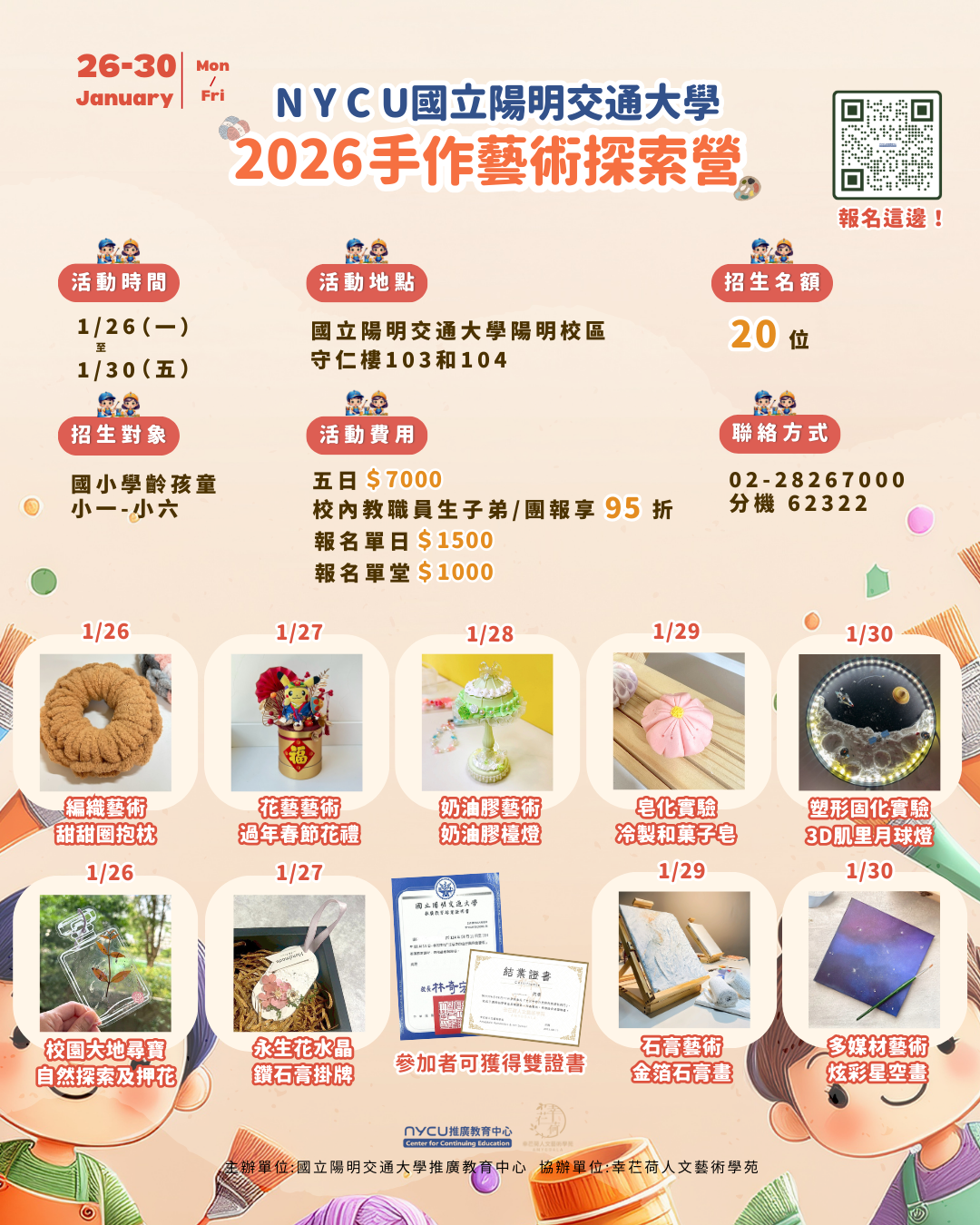 一、本校推廣教育中心將於115年寒假辦理「2026手作藝術探索 營」5日兒童課程,引導孩童探索手作藝術創作的樂趣。 二、詳細課程資訊如下: (一)課程日期:115年1月26日至30日,共5日課程。 (二)課程時間:上午9時至下午4時。 (三)課程費用: 1、單日課程定價1500元/天。 2、全報5日課程優惠價:7,000元/人。 3、鼓勵孩子們一同參與,3人以上團報5日課程,再享95 折優惠:6,650元/人。 (四)課程對象:國小學齡孩童(小一~小六)。 (五)課程地點:本校陽明校區守仁樓。 (六)課程網址:https://cec.nycu.edu.tw/Course/CourseInfo?CId=92923。 三、報名方式:請至本校推廣中心網站(https://cec.nycu. edu.tw/),註冊成為會員後,點選課程報名。 四、如有任何問題請洽本校推廣教育中心,電話:02-2826- 7000分機62322、62306。