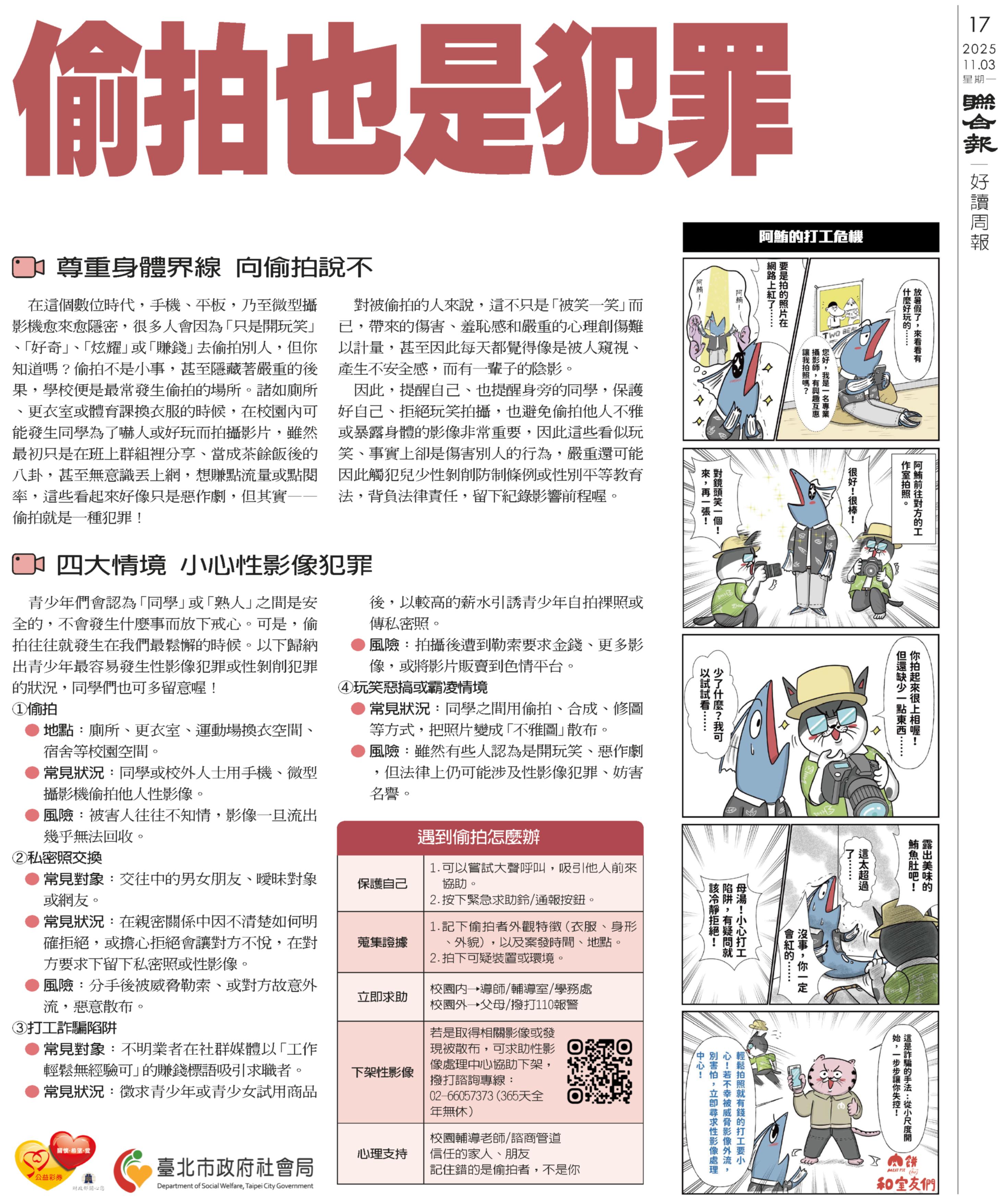 一、依據該局114年12月1日北市社兒少字第1143193957號函辦 理。 二、該局製作旨揭兒少性剝削防制宣導內容說明如下: (一)3篇圖文設計:宣導故事之內容涵蓋3個主題,包括「偷 拍的玩笑也可能觸法」、「網路交友風險」及「打工詐 騙陷阱」。 (二)2款宣導主題圖案: 1、宣導主題1:嚴禁偷拍,威脅不在。 2、宣導主題2:勇敢求助,拒絕被偷拍。(三)1篇專題文章,標題為:偷拍也是犯罪。