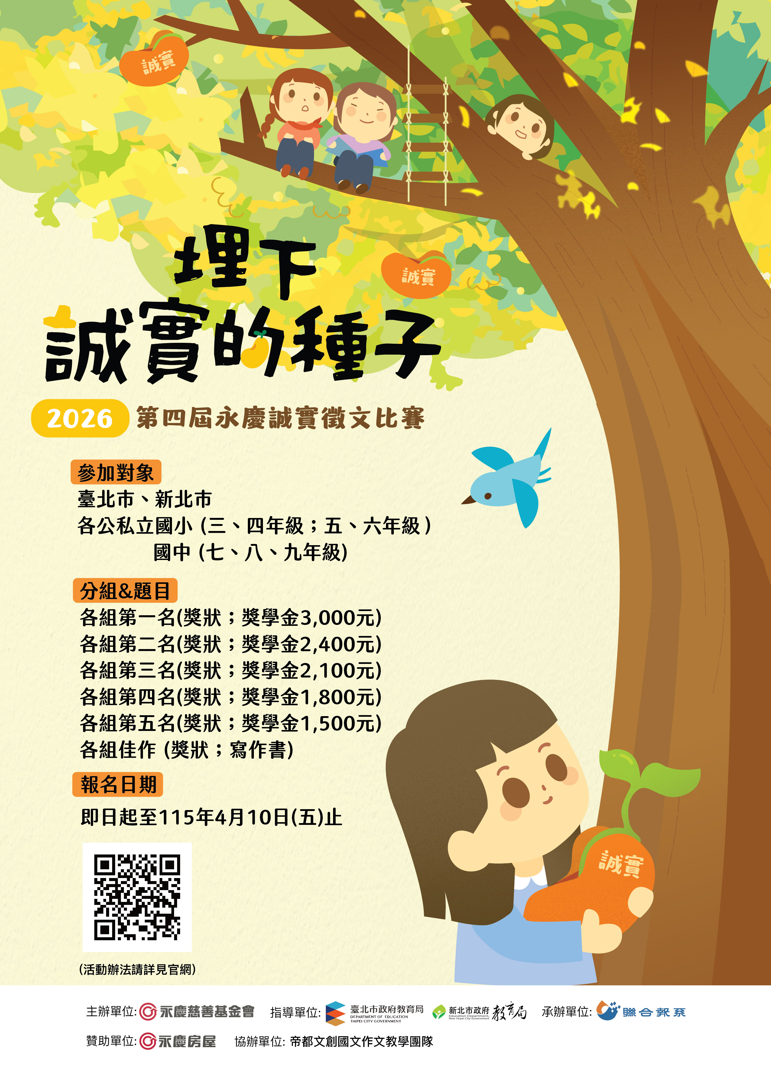 一、依據永慶房屋第四屆品格教育徵文活動計畫辦理。 二、旨案乃為透過徵文活動,培養學生對於生活的觀察力,並 從寫作中探索自我價值與思潮,讓品格教育的觀念向下扎 根,以「埋下誠實的種子」為主題,希望學生從將品格素 養融入文字的過程中,亦將優良德行落實於日常生活、徵 文活動內容摘要如下: (一)參加對象:本市各區國小3至6年級、國中7至9年級。 (二)分組及題目: 1、國小中年級組( 3、4年級):我心目中的誠實小英雄。 2、國小高年級組( 5、6年級):那一刻,我選擇誠 實。 3、國中組(7、8、9年級):誠實與信任。 (三)執行期程 1、區賽: (1)收件:115年1月5日(星期一)起至115年4月10日 (星期五)。 (2)評選:115年4月25日(星期六)起至115年5月3日 (星期日)。 (3)公布:115年5月11日(星期一)。 2、頒獎典禮(暫定):115年5月23日(星期六)。 (四)比賽辦法:依據題目撰寫作文,字數限制為600字稿紙最 多2張。 三、本案相關問題請逕洽聯合報印發部北部業務組(03) -3314188分機3011、3022 張小姐。
