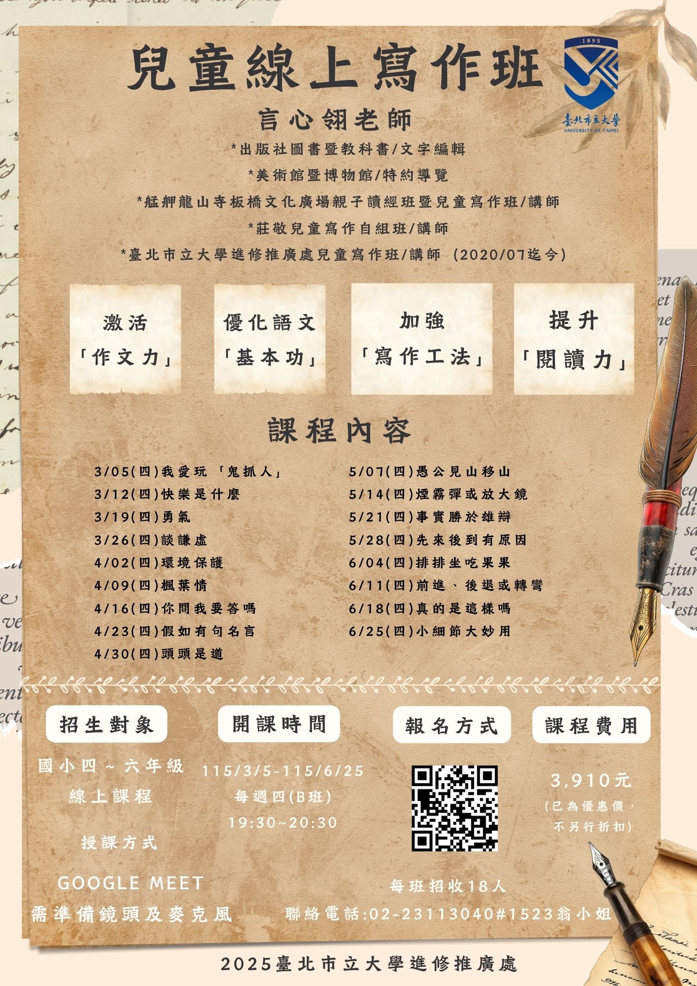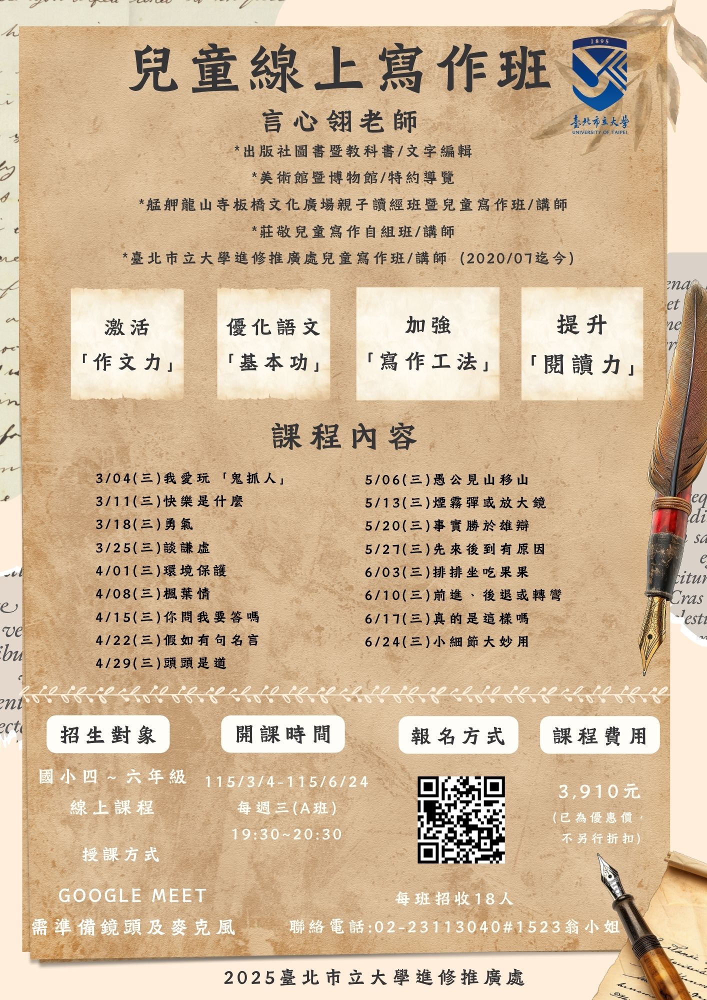 一、旨揭活動業公告於本校博愛校區進修推廣處網站 (https://cee.utaipei.edu.tw/),課程詳細資訊請至網 站查詢。 二、課程時間:115年3月4日至115年6月25日,每週三A班及週 四B班。 三、招生對象:國小四年級至六年級學生。 四、報名日期:即日起至115年2月24日止。 五、請貴單位協助向職員或在校生宣導旨揭活動或張貼於貴單 位公布欄,至紉公誼。 六、檢附課程招生海報2份,如有課程相關疑問,請逕洽本案承 辦人翁小姐(02-23113040轉分機1523)。
