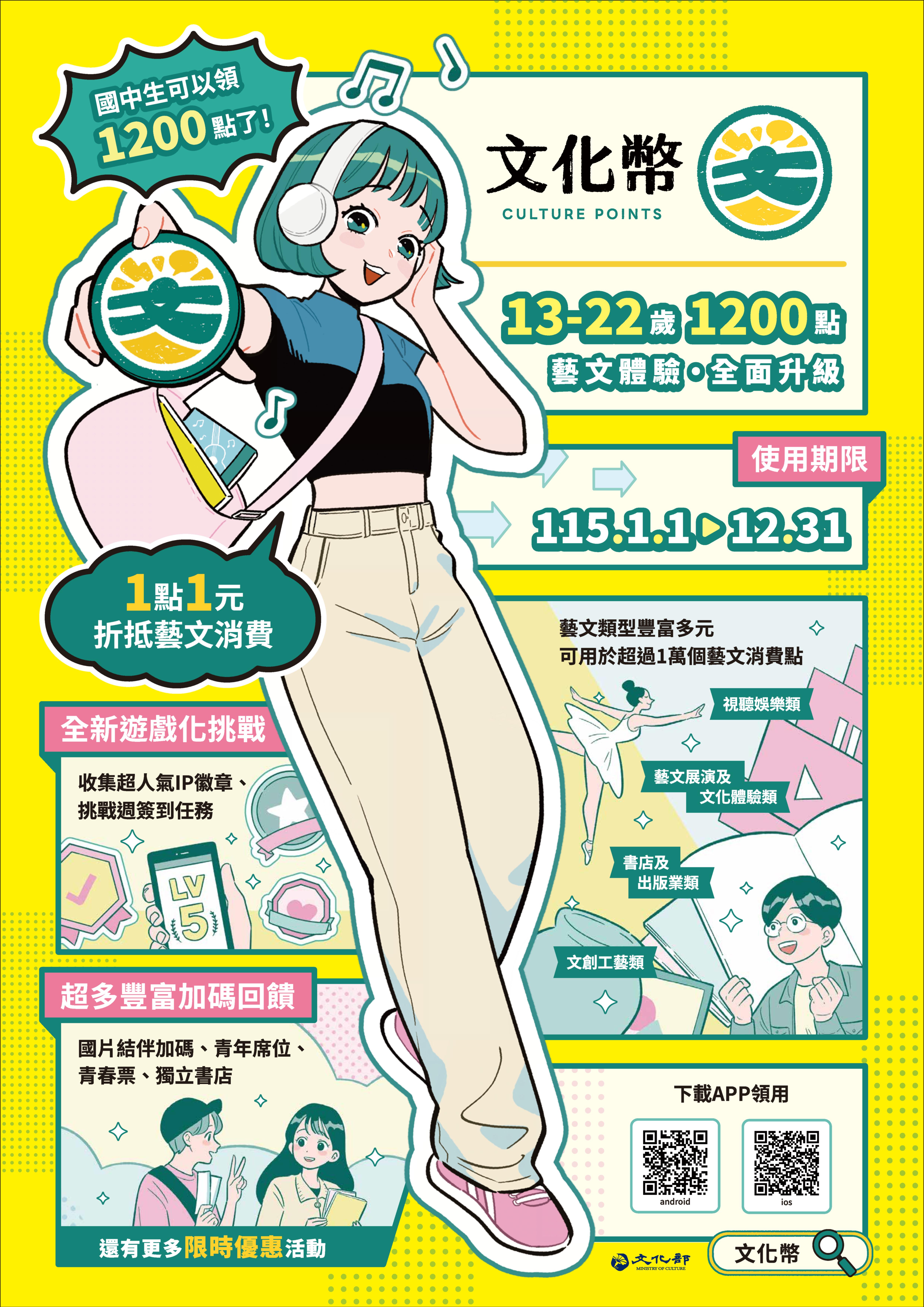 一、依據文化部115年1月7日文創字第11430361211號函辦理。 二、為鼓勵青少年的藝文參與體驗,促進藝文產業發展,文化 部自112年起發放文化禮金,作為看國片、看表演、買書、 逛博物館、手座DIY等藝文消費折抵使用。自115年起,文 化禮金發放對象為13—22歲每人1,200點文化幣(1點等同 新臺幣1元)。 三、有關文化禮金相關資訊如下: (一)領用資格:凡出生日期在93年1月1日至102年12月31日 的,具中華民國國籍或符合資格的外國人士等,皆可領 取1,200點文化禮金。 (二)怎麼領取:手機下載「文化幣」APP,輸入手機、密碼及 e-mai完成註冊後點選文化禮金,輸入姓名、身分證字 號、健保卡號、出生日期、居住地及戶籍地,16—22歲新增輸入「領補換類別」及「發證日期」,通過驗證即 可取使用。 (三)如何使用:自115年1月1日起至115年12月31日止,至全 國超過1萬個藝文消費點進行消費折抵。 (四)APP體驗升級:全新會員等級、蒐集徽章任務、週簽到獎 勵,在探索藝文的過程中,一路升級,不僅可以獲得加 碼文化幣,還有機會把聯名IP周邊商品帶回家(聯名IP 周邊商品抽/贈獎規則另於文化幣官網公告)。 (五)有哪些優惠: 1、獨立書店點數放大:尋找貼有「本店適用獨立書店點 數放大專案」識別標誌的獨立書店,每消費2點回饋1 點,回饋點數最高為當年度文化禮金50%,回饋上限 600點。 2、表演藝術五折青年席位:以青年易於入手之優惠優惠 價格,提供包含劃定視線優良區域之「青年席位」, 以及可自由選位之「五折自由座」。 3、結伴看國片及青春早安場:多人同行看國片,只要其 中1人單次使用文化幣購票消費達350點以上,即可獲 得加碼100點回饋點數,回饋次數無上限。在115年1月 1日至115年3月31日期間限定推出青春早安場全時段2 點送1點,消費達350點,回饋200點。 4、單筆消費滿200點立即抽獎:單筆消費滿200點就立即 抽獎,抽獎次數不限。抽獎結果於系統馬上呈現即可 使用。 5、邀請好友回饋:已領取文化成年禮金的青年,只要邀請2名好友成功領取即可獲贈30點,之後每邀請1名好 友即可獲得10點,回饋無上限。 四、檢附宣傳海報及懶人包各1份,其他相關宣傳影片及文宣電 子檔請至雲端連結下載:https://reurl.cc/3bYGRR。請惠 予透過校內宣傳管道週知師生(如:電子郵件、公告欄、 電視牆、校務系統、通訊軟體、社群媒體平台等),並鼓 勵符合資格學生參加。