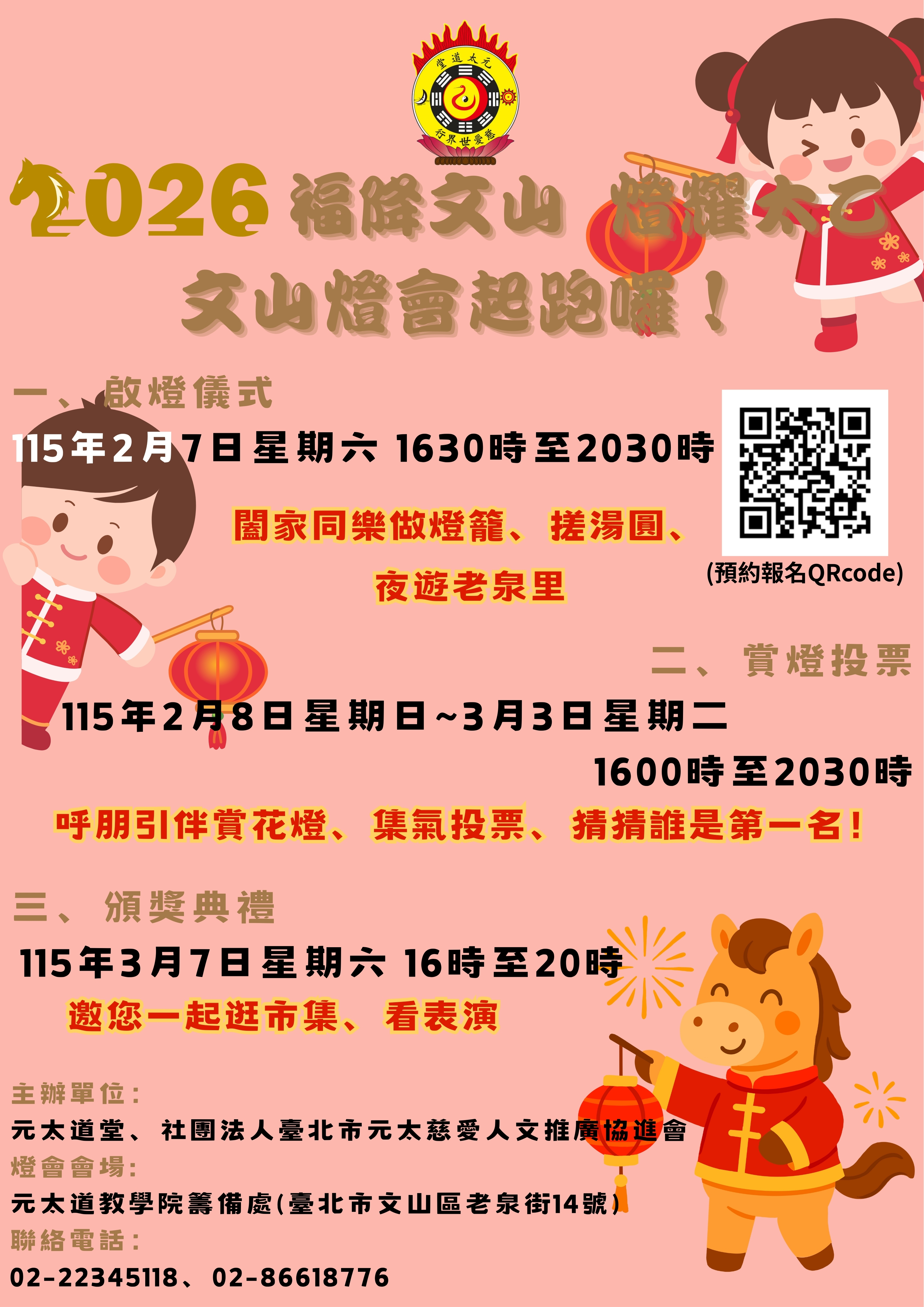 一、依據社團法人臺北市元太慈愛人文推廣協進會115年1月15 日元太會字第11501140012號函辦理。 二、旨揭活動相關期程如下: (一)點燈儀式:115年2月7日(星期六)下午4時至8時30分, 屆時將安排傳統元宵燈節活動:搓湯圓、做火把、做燈 籠。 (二)活動地點:元太道教學院籌備處(臺北市文山區老泉街 14號)。 (三)投票參觀:115年2月8日(星期日)至3月3日(星期二) 止,每日下午4時至8時30分開放會場參觀進行人氣投票 (每日每人限投1票)。 (四)得獎公佈:115年2月12日(星期四)公布各校同學獲獎 名單(名次併同人氣獎於115年3月4日公佈)。(五)頒獎典禮:115年3月7日(星期六)下午4時至晚上8時; 邀請各界嘉賓、學校師長、同學及家長參加。 三、活動報名採電子表單報名https://forms.gle /JdKdEreZY6vnkMtT9。其他相關細節請依以本屆計畫書 https://reurl.cc/rvYa04為準。