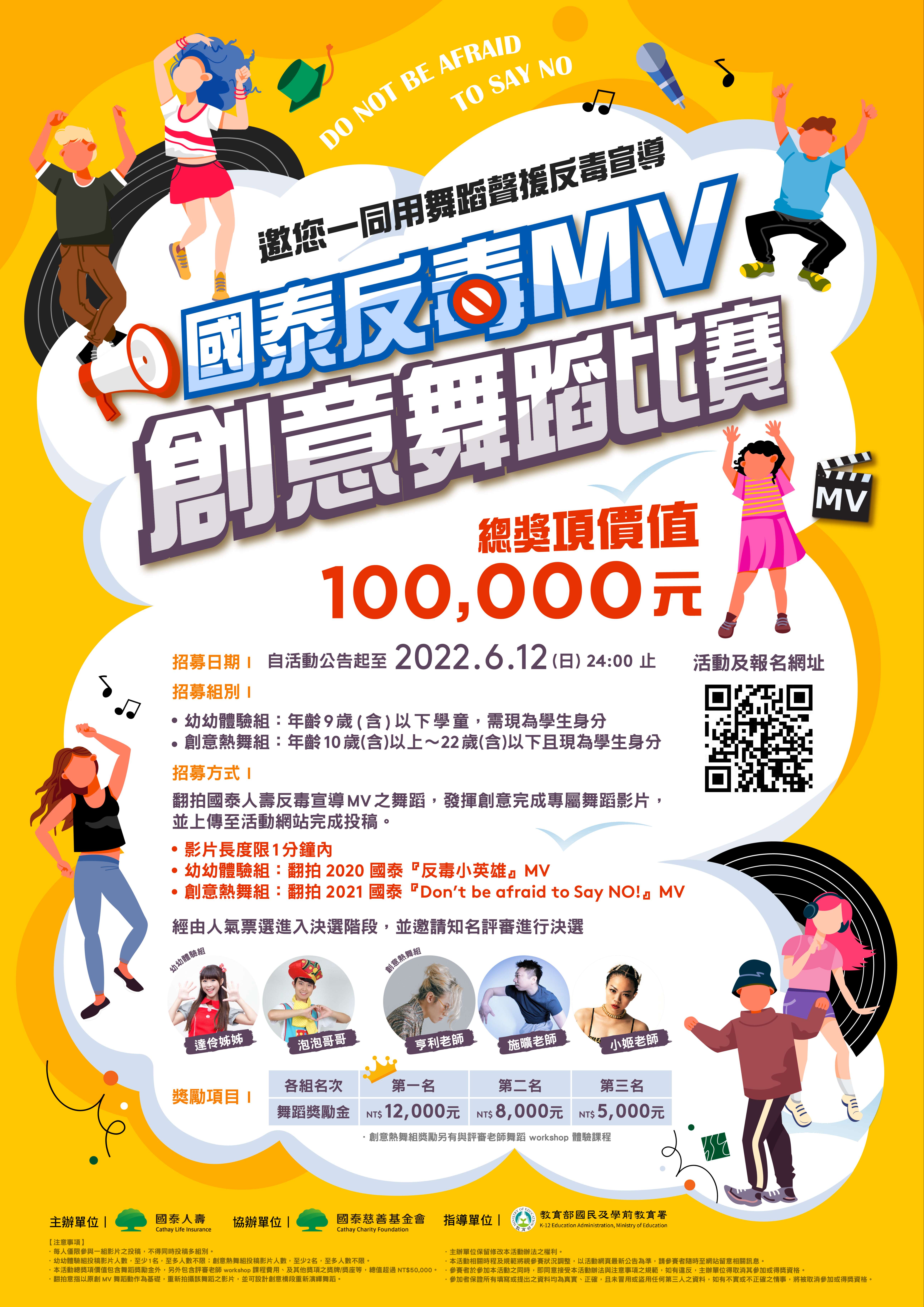 一、依據教育部國民及學前教育署111年5月20日臺教國署學字 第1110066162號函辦理。 二、旨揭活動內容摘要如下: (一)活動期間為111年5月20日(星期五)起至111年6月12日 (星期日)止。 (二)參賽者區分為幼幼體驗組與創意熱舞組,幼幼體驗組以 「反毒小英雄」為舞蹈音樂,創意熱舞組則以「Don’t Be Afraid to Say No」為舞蹈音樂,自由發揮創意編排 舞蹈,並進行短影片拍攝。 (三)透過創意舞蹈呈現,將影片上傳至活動專頁,並發起全 民票選活動,選出最受歡迎之舞蹈影片進入決選,由專 業舞蹈評審進行線上評選,最終評選獲前3名的隊伍將頒 發獎金以資鼓勵。三、活動海報電子檔如附件,紙本海報於111年5月20日(星期 五)由該基金會陸續寄達後轉發各校,請協助張貼,並廣 布宣傳。 四、若有相關疑問或需求,請逕洽活動聯絡人:02-27527899分 機1776(王小姐、黃先生)、02-27551399分機2006(唐小 姐)、2164(盧小姐)。