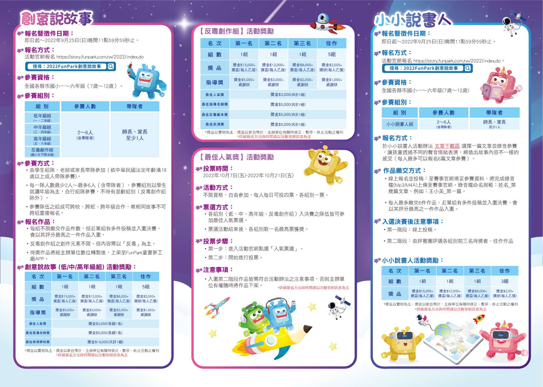 四、活動資訊如下: (一)徵件日期:即日起自111年9月25日止。 (二)官網:https://story.funpark.com.tw/2022/index.do