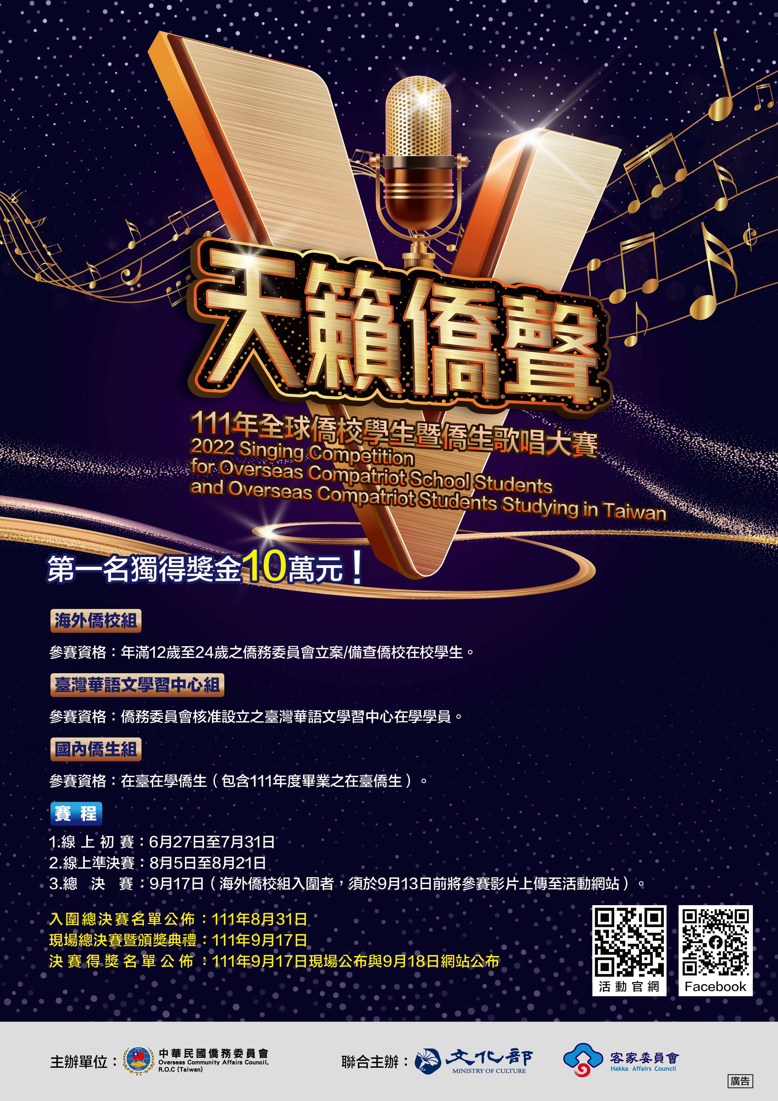 一、依據僑務委員會111年6月24日僑教社字第1110201491A號函 辦理。 二、僑務委員會為鼓勵全球僑校學生、臺灣華語文學習中心及 國內僑生藉由傳唱華語、閩南語及客語等歌曲,強化華語 文學習動機、認識及體驗臺灣不同族群語言及流行音樂文 化,爰規劃辦理旨揭賽事。 三、本賽事分為「海外僑校學生組」、「臺灣華語文學習中心 組」及「國內僑生組」,謹就「國內僑生組」部分,說明 如下: (一)參賽對象 1、在臺在學僑生(包含111年度畢業之在臺僑生及港澳生),不含陸生及外籍生。 2、線上初賽以「個人」為參賽單位;線上準決賽及總決 賽可邀請其他符合資格之僑生組成團隊(包含人聲與 伴奏),但每1人以參加1組為限。 3、已簽定唱片(演藝經紀)合約之職業歌手不得參賽; 曾獲本會歌唱比賽第1名者3年內不得參賽。 (二)預定賽程 1、線上初賽:111年6月27日至111年7月31日。 2、線上準決賽:111年8月5日至111年8月21日上傳參賽影 片至活動網站,經評審後於111年8月31日前公布總決 賽入圍名單。 3、總決賽:111年9月17日。 (三)活動方式及賽程說明 1、線上初賽:參賽者至活動網站註冊報名及參賽,選唱1 首指定曲,並由比賽專用AI系統依預設標準評分,依 分數高低選出前100組。 2、線上準決賽:100組參賽者由本會指定曲曲目中選擇錄 製1首演唱影片,一鏡到底,可自行改編或加入創意, 但不可後製修音。影片錄製完成後上傳活動網站,由 專業評審評選出15組進入總決賽,並由本會確認入圍 者參賽資格;另本會得視情況酌予增加選唱閩南語及 客語入圍總決賽之名額。 3、總決賽:參賽者自指定曲選擇1首演唱(須與準決賽曲 目不同),可自行改編並加入創意,原則採現場演唱 方式比賽。(四)比賽規則 1、選曲:線上初賽、線上準決賽及總決賽皆自指定曲曲 目中選擇1首歌曲演唱;另總決賽演唱曲目須與準決賽 曲目不同。 2、曲目:計35首,包括華語15首、閩南語10首及客語10 首。 3、編曲及伴奏 (1)線上初賽:須配合AI系統音檔依原曲演唱,毋須自 備樂器伴奏。 (2)線上準決賽及總決賽:可自行改編表演歌曲,亦可 自行準備伴唱音樂或自備樂器伴奏。 (3)誠信原則:參賽作品應符合本活動比賽規則,不得 有代唱、對嘴之情形,應全程一鏡到底,錄製完 整,且不得透過後製軟體修音,如有違反,經查 證 屬實,將予取消參賽/獲獎資格。 (五)獎項及國慶晚會演出 1、第1名獎金新臺幣(以下同)10萬元,第2名6萬元,第 3名3萬元,優選3名各1萬元;另設「最佳閩南語歌曲 表演」獎1名、「最佳客語歌曲表演」獎1名,獎金各 為3萬元,均含獎盃及獎狀。 2、本會安排國內僑生組總決賽第1名之得獎者參加國慶晚 會演出。 (六)補助(屆時檢據核實報支) 1、本會將提供入選決賽者居住外縣市至臺北市之高鐵來 回車票補助費及彩排當日住宿費(限新竹以南者)。2、優勝者參加國慶晚會演出人員治裝費、梳妝費及住宿 費等每人補助上限2萬5,000元。 3、獲得前3名者,可選擇國內流行音樂相關培訓機構或師 資進行培訓課程,本會提供課程補助費每人上限3萬 元,屆時檢附收據及結業(訓)證明相關文件核實報 支。 四、線上初賽預計於111年6月27日正式開賽,請有意報名學生 自即日起至報名網站(https://singocac.tw)註冊,註冊 後即可自111年6月27日起利用同網站進行線上初賽,參賽 流程詳附件「網站操作說明」。倘參賽者有相關疑問,可 洽客服電子郵件信箱:Sing.official@dwave.cc。另本活 動設有臉書粉絲專頁(https://www.facebook.com /SingOCAC),請提供僑生踴躍按讚分享。 五、檢附網站操作說明及宣傳海報各1份。